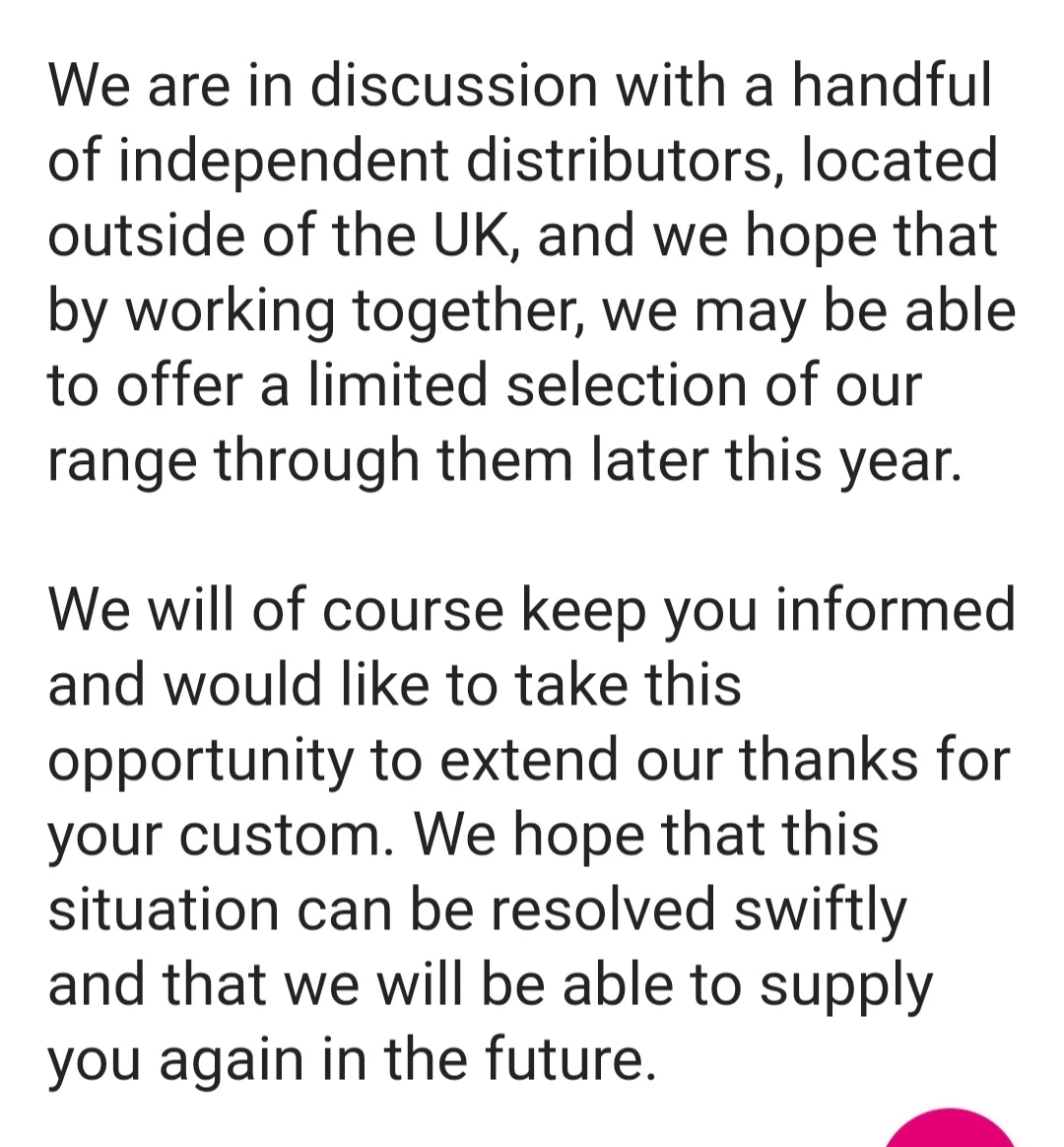 In der eMail stand noch, dass man nach Lösungen sucht und hofft, dass irgendwann in den nächsten Jahren auch wieder nach außerhalb GBs versendet werden kann.