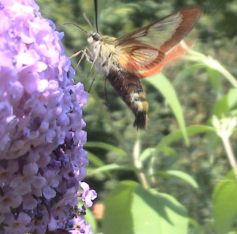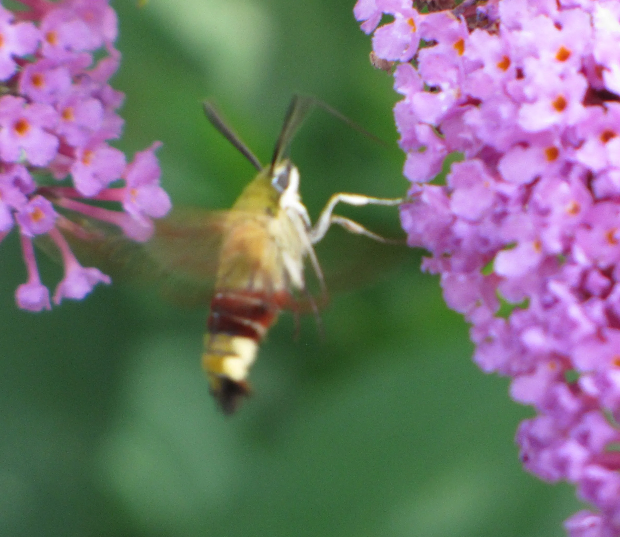Aber ich brauchte gestern hier nur öffentlich jammern - schon waren heute zwei Hummelschwärmer an der Buddleja - aber noch unschärfer als das alte Bild.