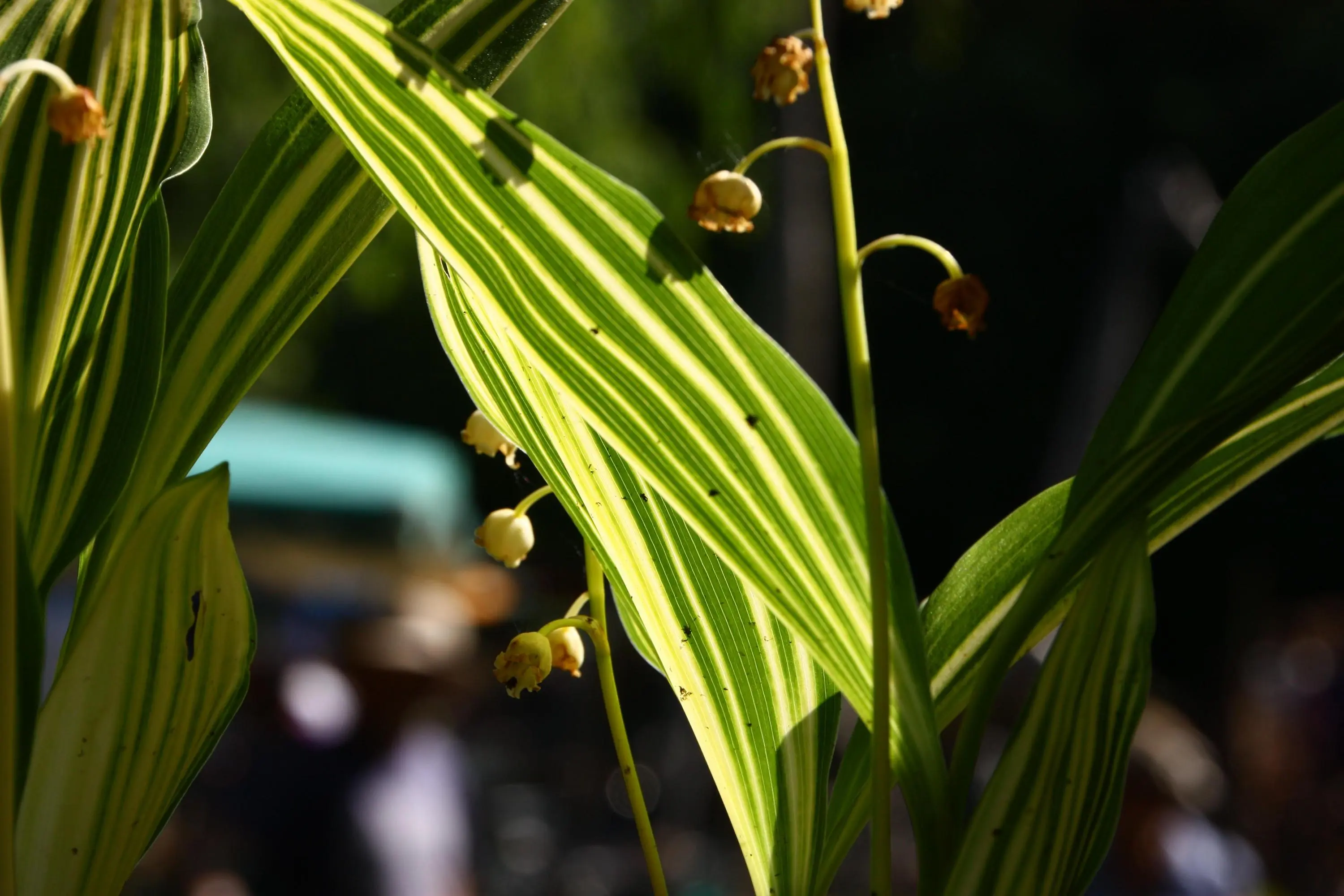 • Das schöne panaschierte Blatt eines verblühten Maiglöckchens.