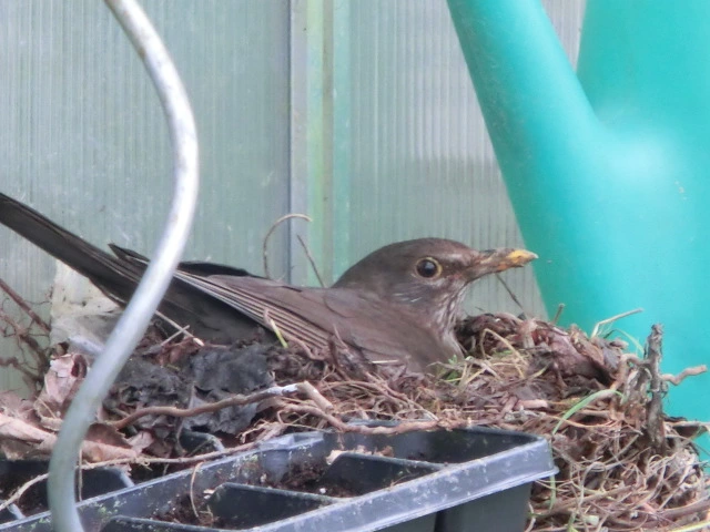 Frau Vogel hat sich ein warmes Nestchen im GWH zwischen Kohlrabinachwuchs und Gießkanne gebaut-noch ohne Eier.Und sie hat sich auch nicht großartig von uns stören lassen..wir arbeiteten vor dem GWH und sie ist ein und aus geflogen.
