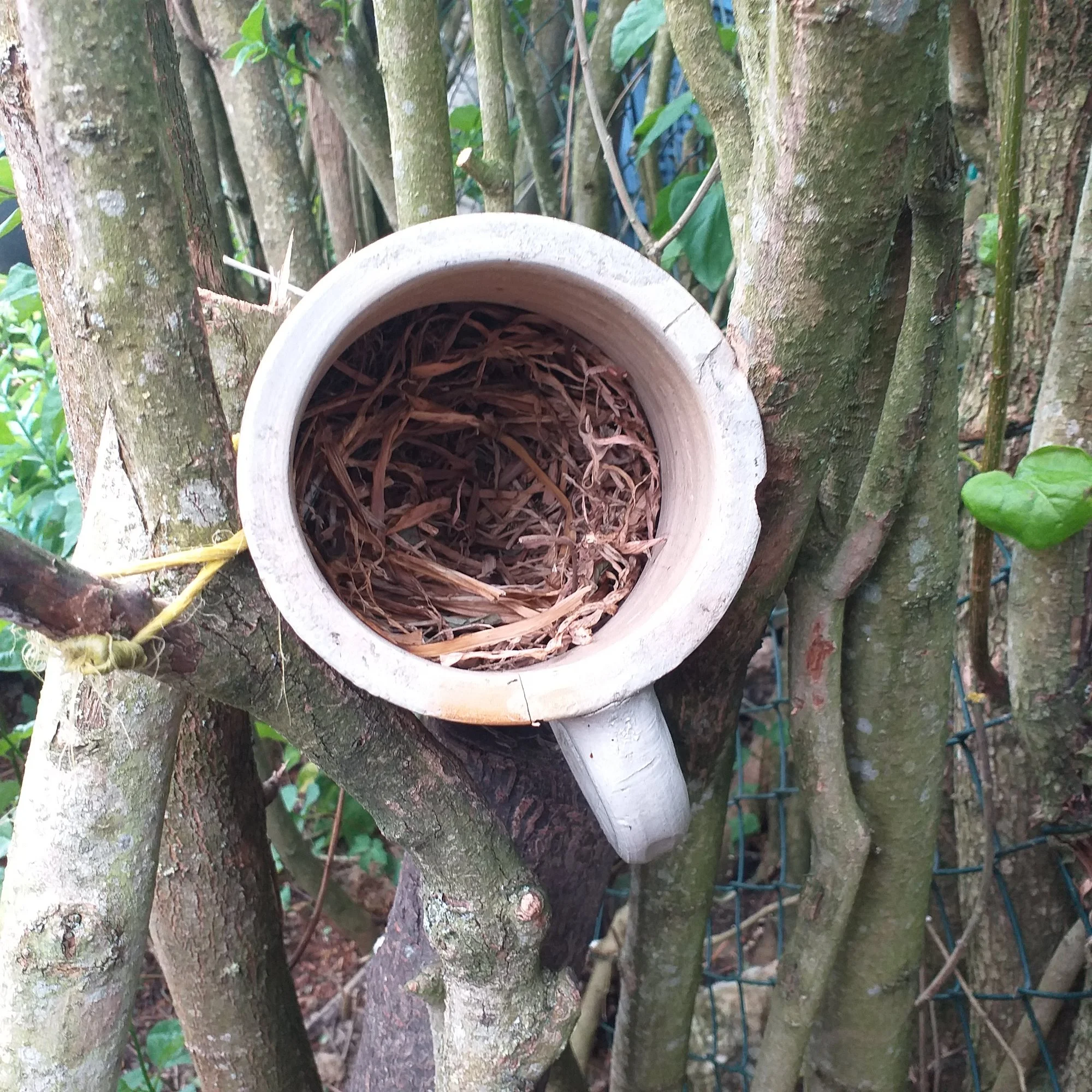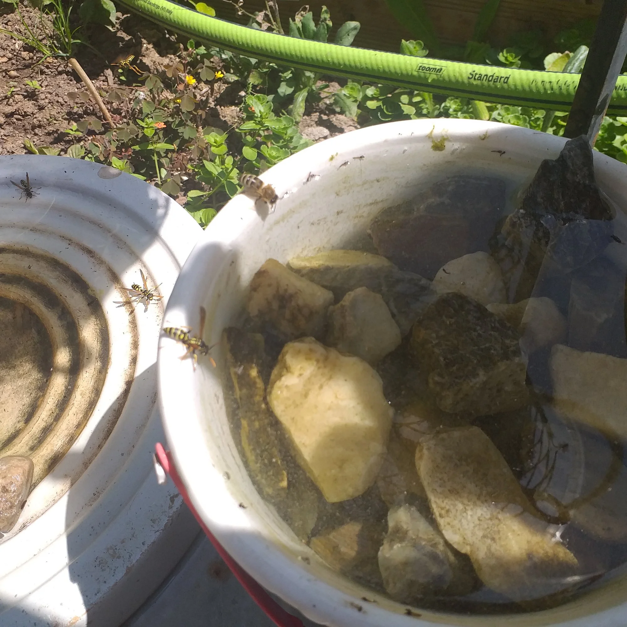 der Kindereimer ist die Lieblingswasserstelle. Die schöne getöpferte Trinkschale ist dieses Jahr nicht aktuell.