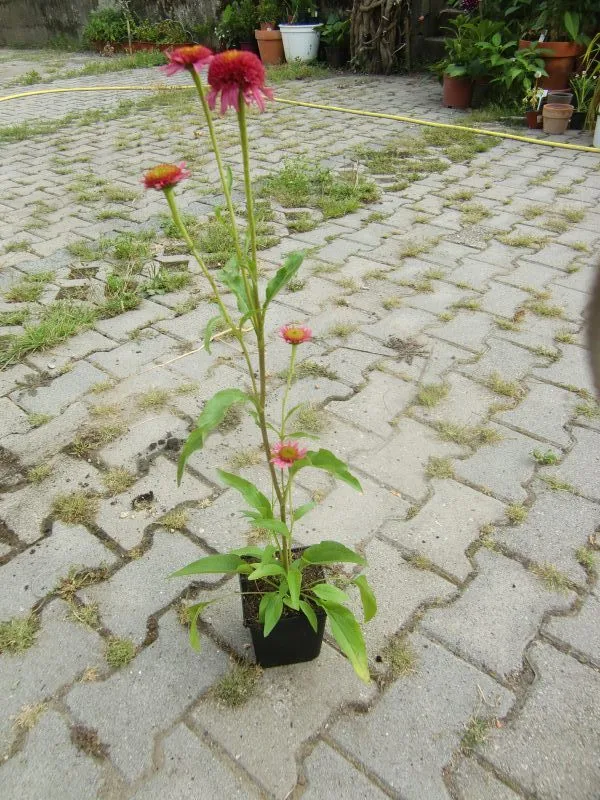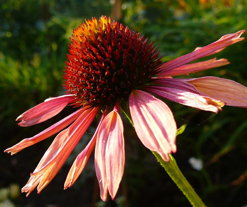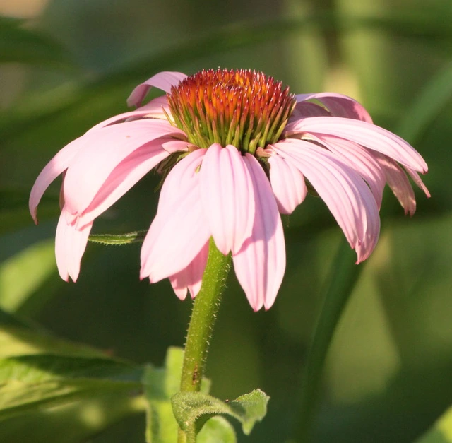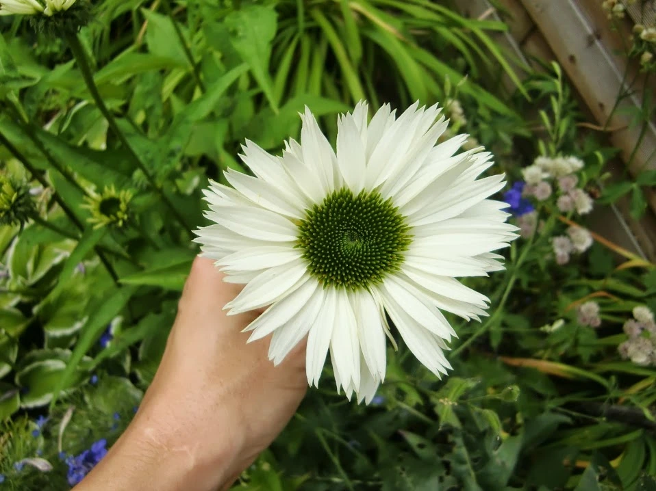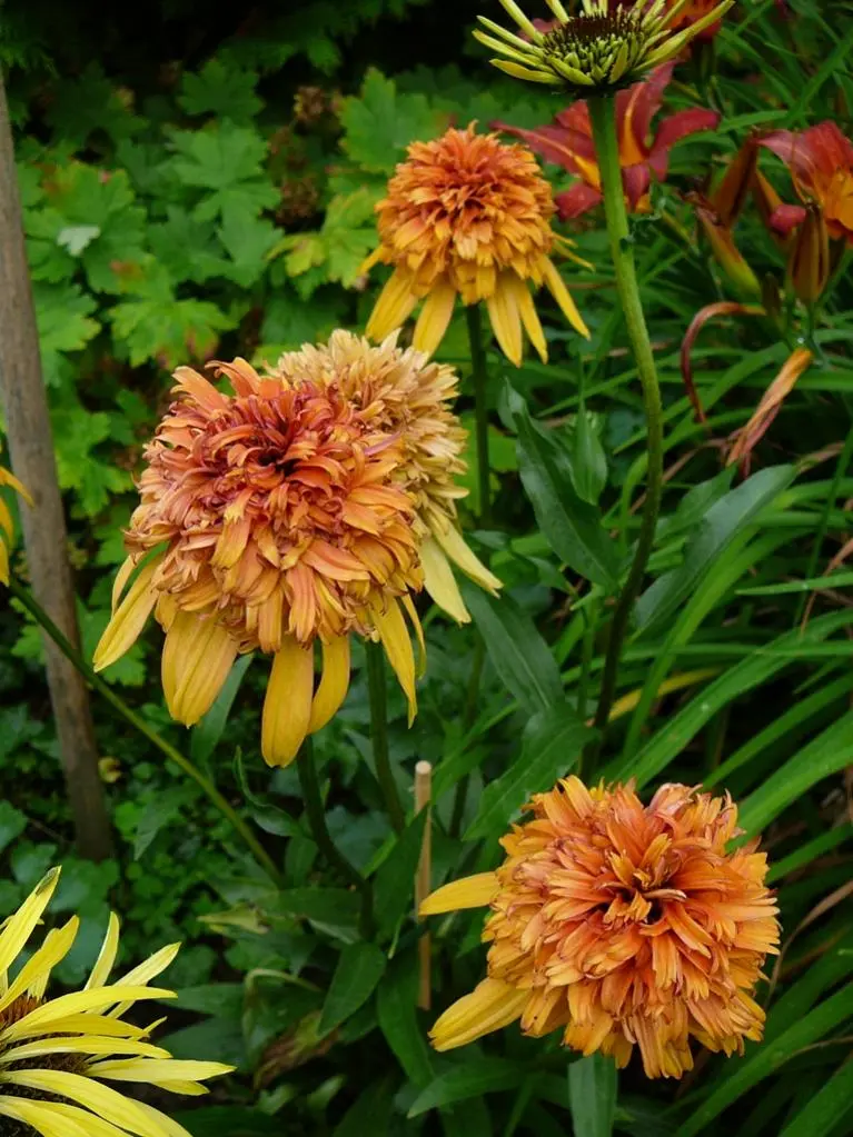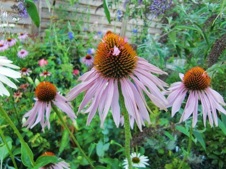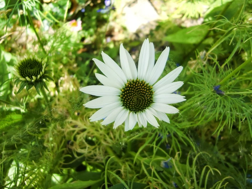 Die Rudbeckia occidentalis war so lang, dass sie sich trotz Anbindens umgelegt hat. Aus den Achseln sprießen süße kleine Blütchen (man möge das zerfressene Blatt ignorieren):