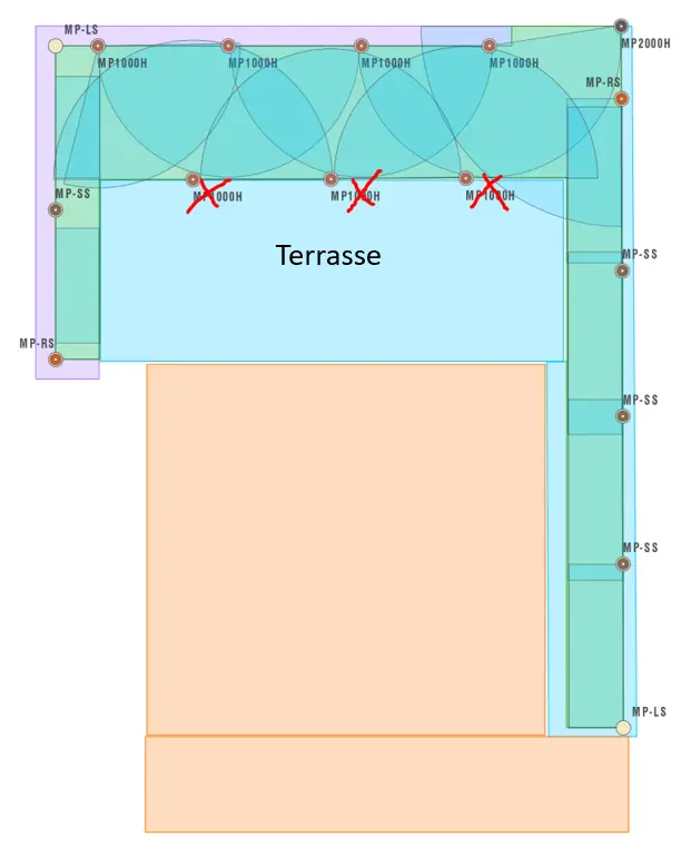 Es soll kein Versenkregner im Bereich der Terrasse sichtbar sein (siehe Bild 1 MP1000h 3x entfernt), sondern nur im Beet/Heckebeet am Aussenrand platziert werden.