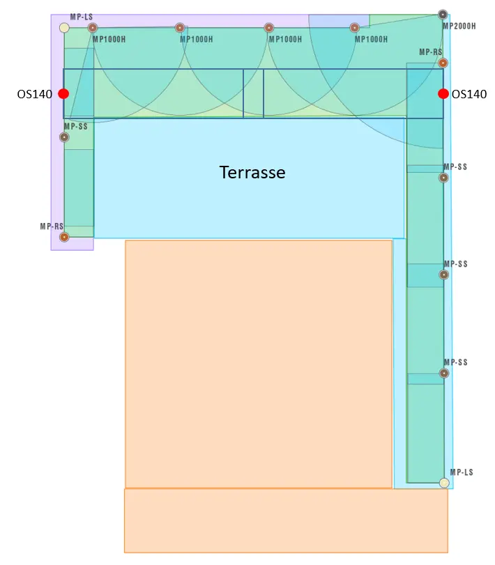 Als Alternative, um den Bereich vor der Terrasse zu bewässern, habe ich mir mal zwei Gardena OS140 eingezeichnet. Könnte das funktionieren oder welche Empfehlung könnt Ihr mir geben?