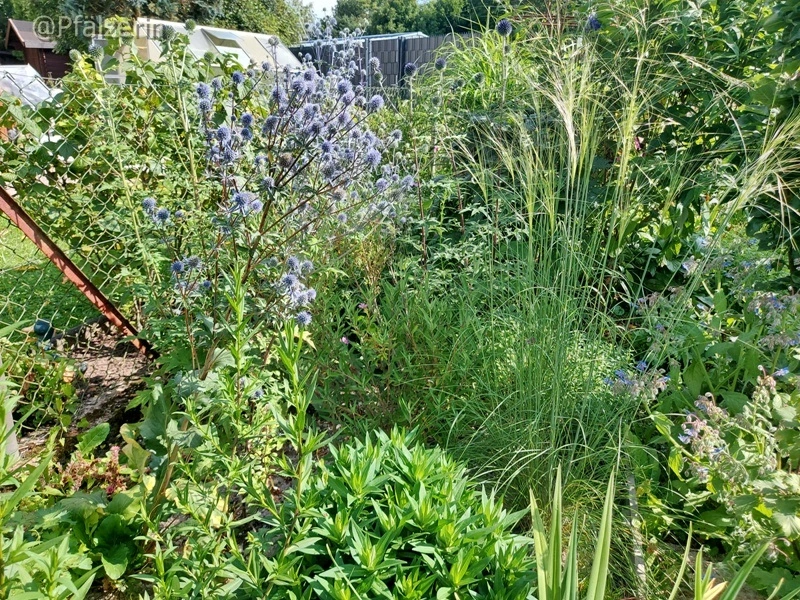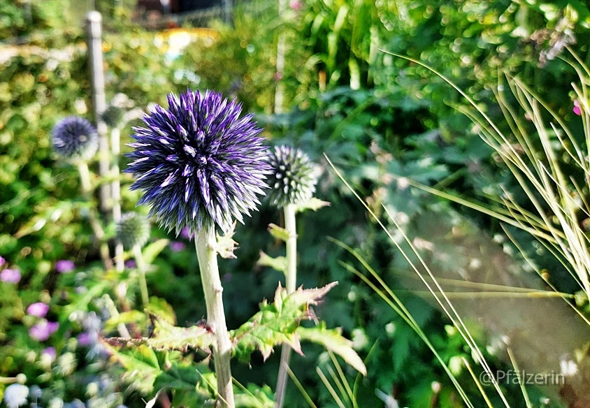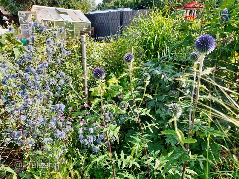 Links das ist der Mannstreu mit etwas kleineren Blüten und rechts sind die Kugeln der Edeldisteln zu sehen. Beide blühen leuchtend blau.