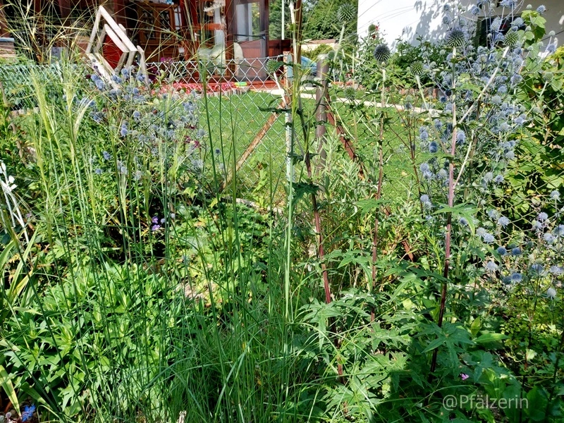 Wie ich schon mal geschrieben hatte, sollte dieses Beet heiße, trockene Sommer überstehen. Es funktioniert auch bei Nässe gut.
