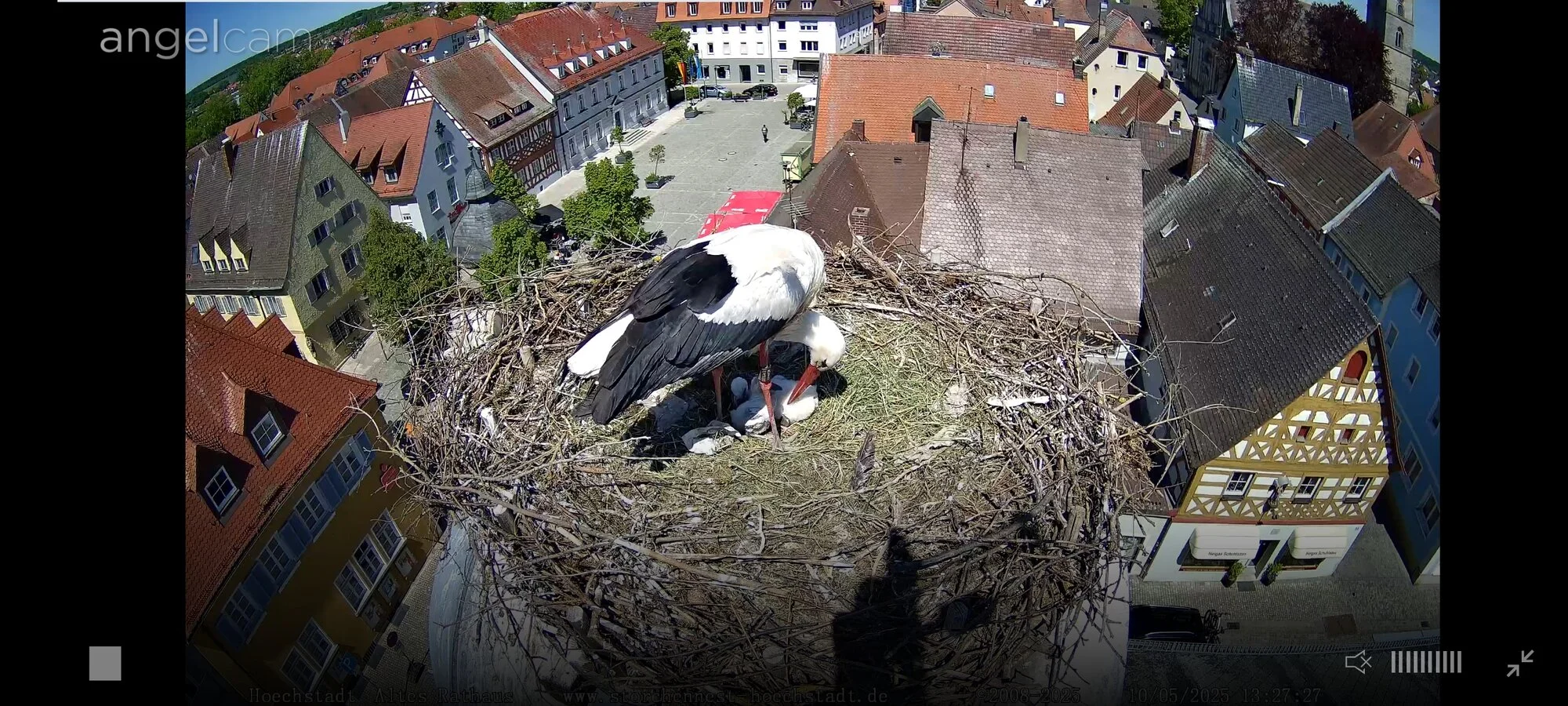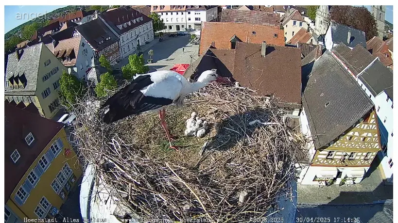 Die beiden vom Rathaus sind schon wieder zurück. Und obwohl das Dach noch nicht saniert ist, haben sie ihr altes Nest auf der Halterung wieder bekommen. Die Störche haben gewonnen