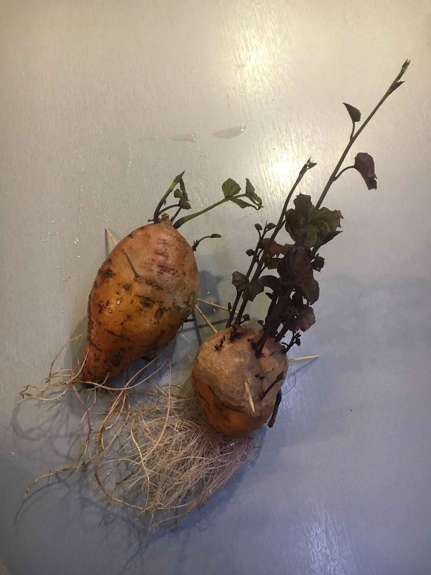 Sagt mal..wie sehen denn Eure Süßkartoffeln aus? Meine hat oben viel Grün und unten weiße Wurzeln....wann kann ich die denn in die Erde setzen? finde dazu leider nichts