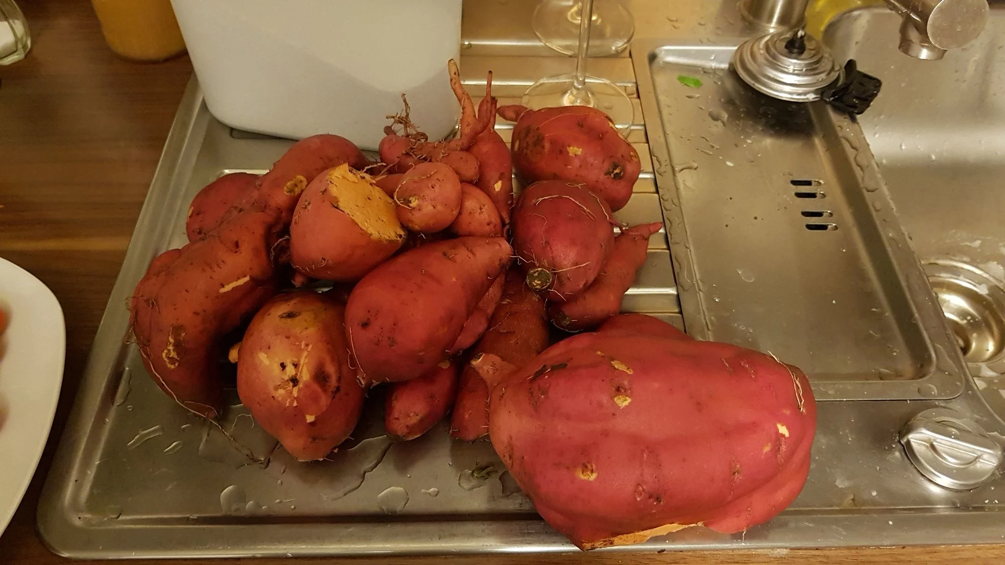 Hab vor zwei Jahren meine erste Süßkartiffel gepflanzt. Triebe im Wasser wurzeln lassen und nach den Eisheiligen gepflanzt. Nur regelmäßig gegossen und ab und an etwas Flüssigdünger. Im nächsten Jahr, gleiche Handlungsweise, anderes Beet, nur 3 kleine Knollen geerntet. Das Bild ist von vor 2 Jahren von 1 Pflanze. Beim Graben im Herbst hab ich dann in ca 40cm noch einige Knollen gefunden