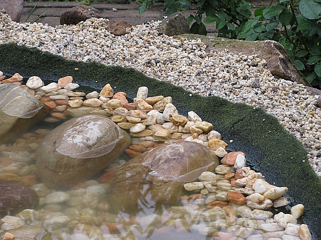 Jetzt bin ich darauf gekommen, dass das totaler Blödsinn ist. Die Sumpfzone muß deutlich tiefer sein, damit die Folie auch bei verändertem Wasserstand nicht zu sehen ist.