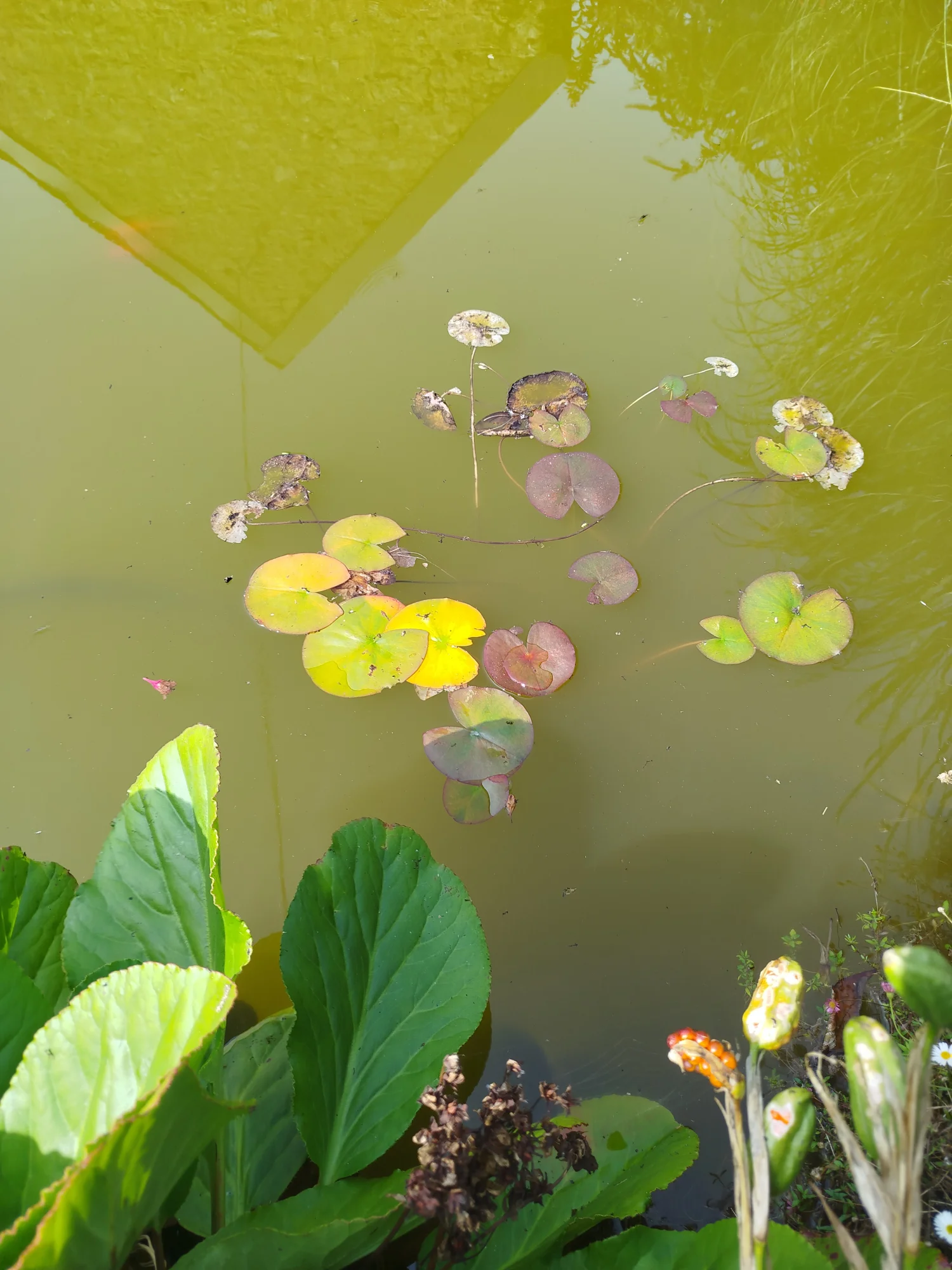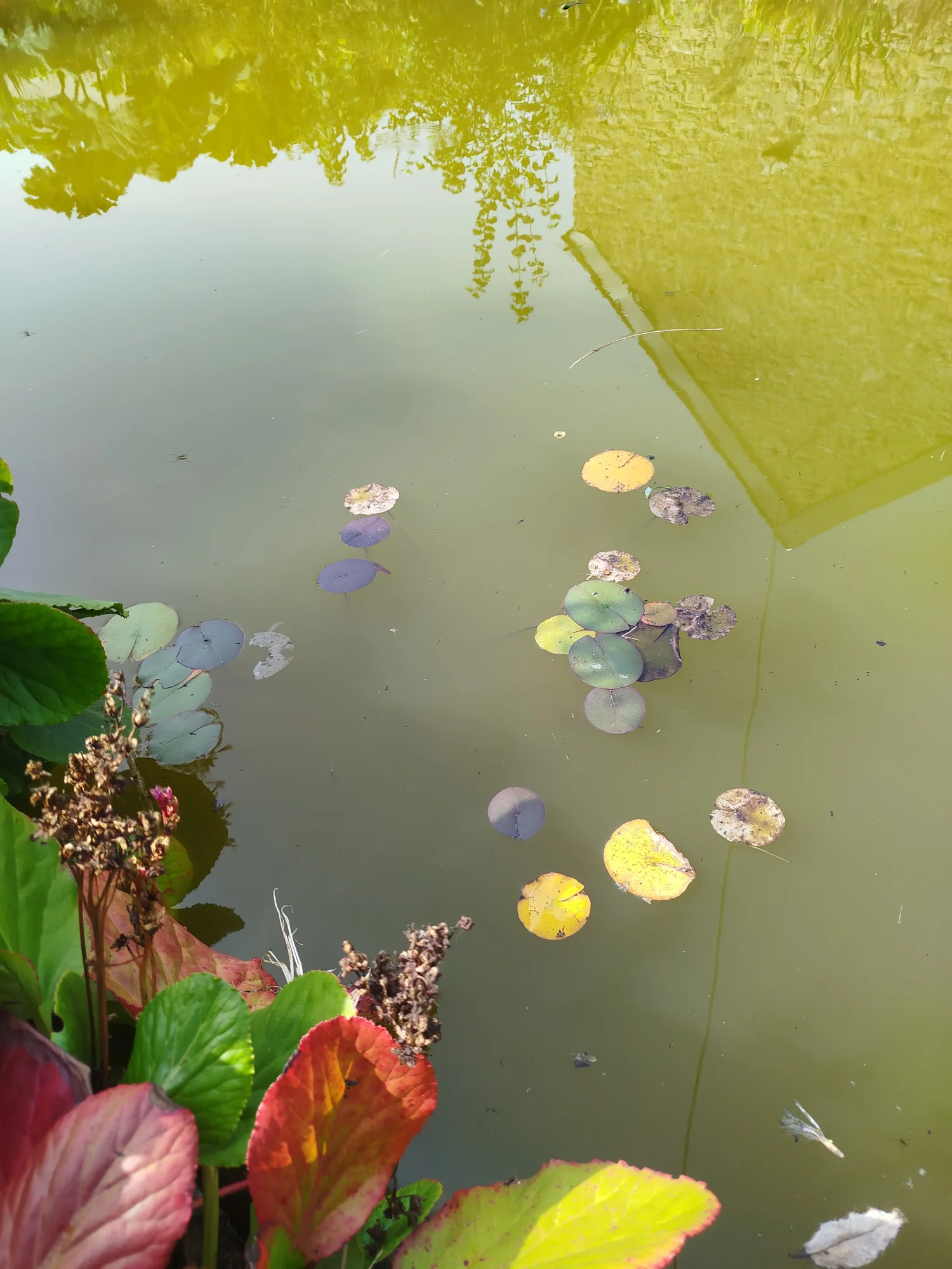 Nach dem Winter ist er meistens klar, im Frühling wird er grün und den Rest des Jahres bleibt er dann braun. Die meisten Pflanzen sterben unter Wasser ab. Lediglich die Teile dir über Wasser stehen bleiben grün. Auch die Wasserminze, die im Wasser steht, wird braun und die am Rand nicht. Wasserpast stirbt sogar.