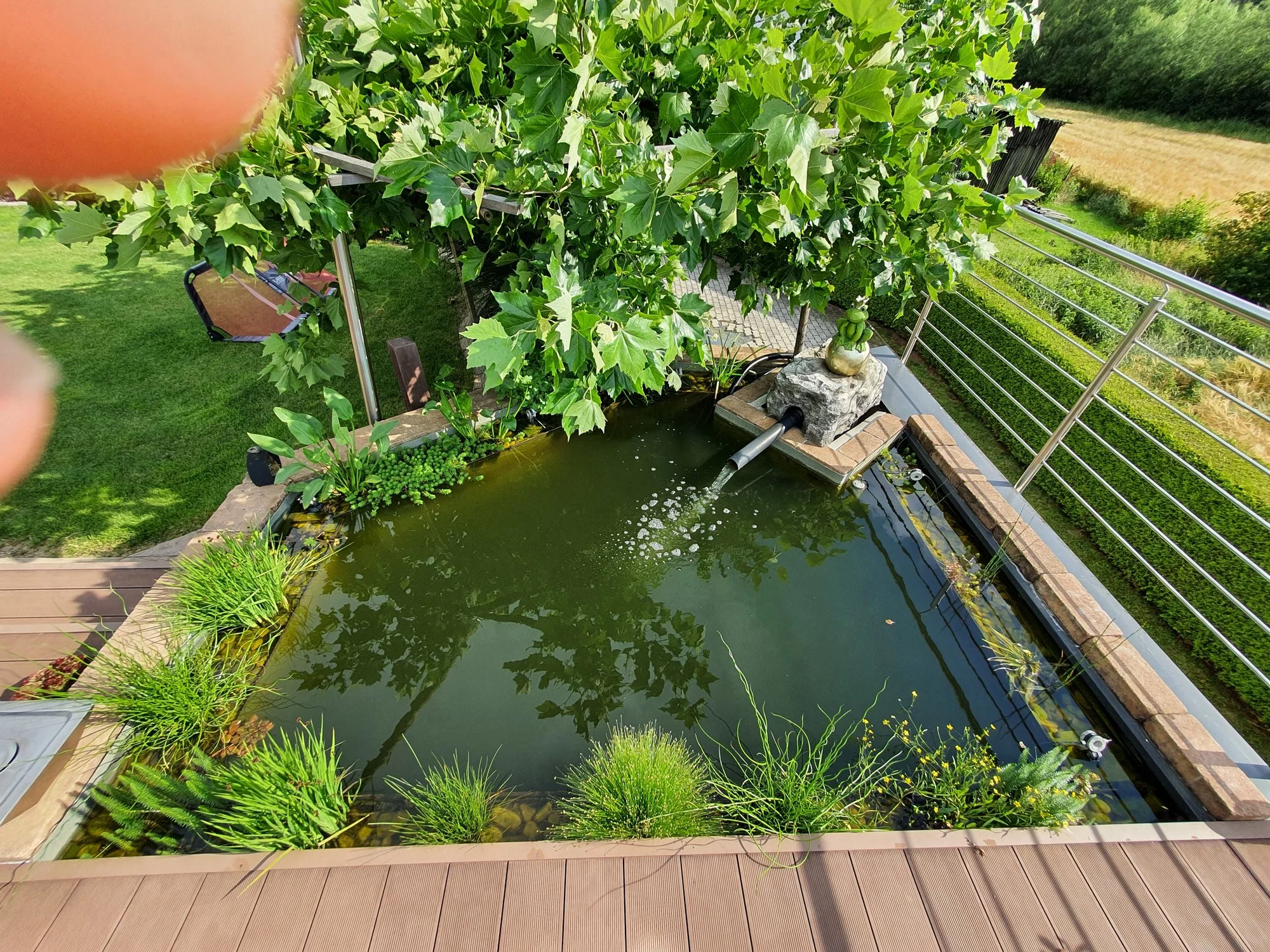 So prächtig in der Sonne bilden sich schnell Algen. M.E: fehlt Schatten. Die aktuellen Temperaturen helfen natürlich der Algenbildung. Aber der Teich hat m.E. noch kein Algenproblem.