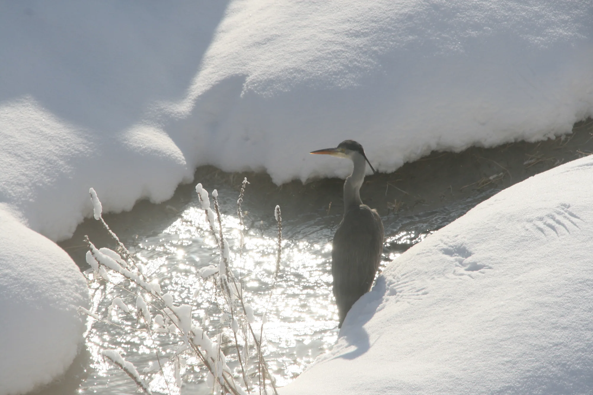 Ein Graureiher am Wehr hinten am Bach.
