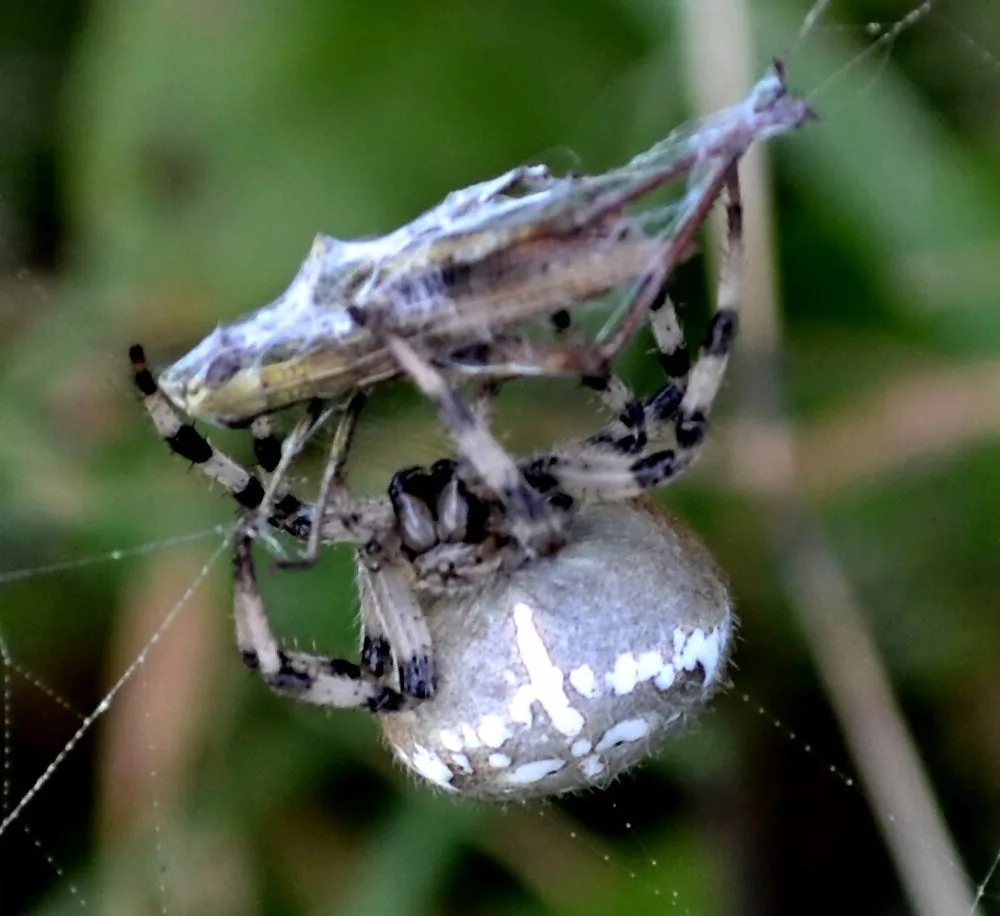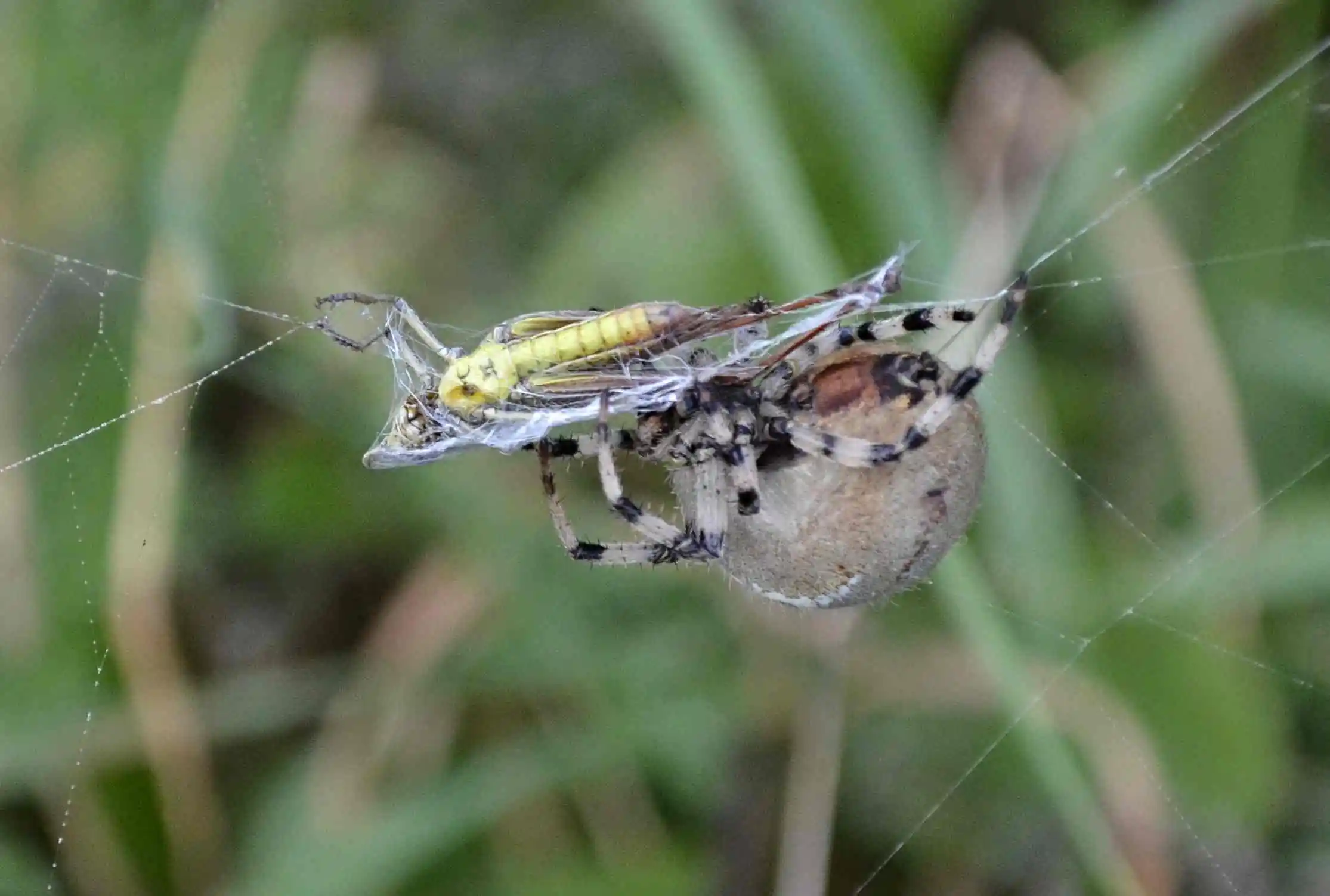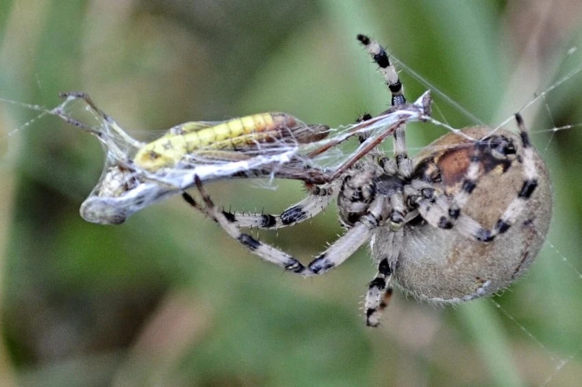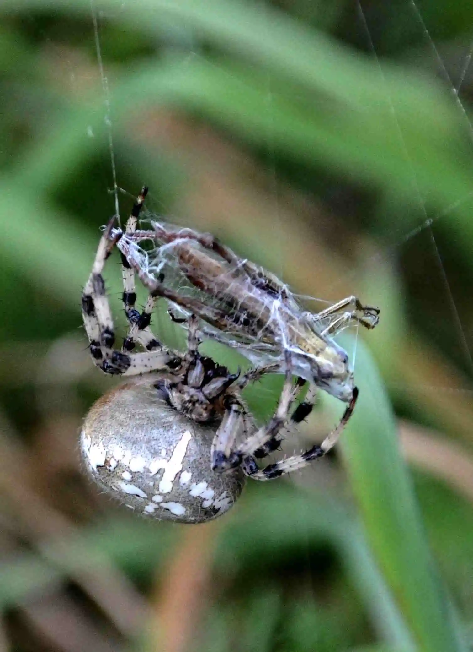 Der Grashüpfer kam dem Netz der Kreuzspinne immer näher und ich stand mit der Kamera bereit.