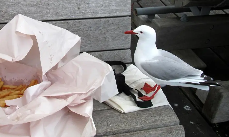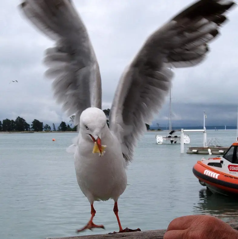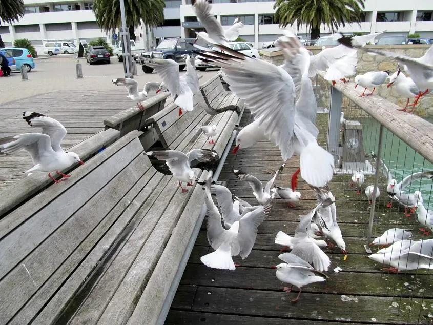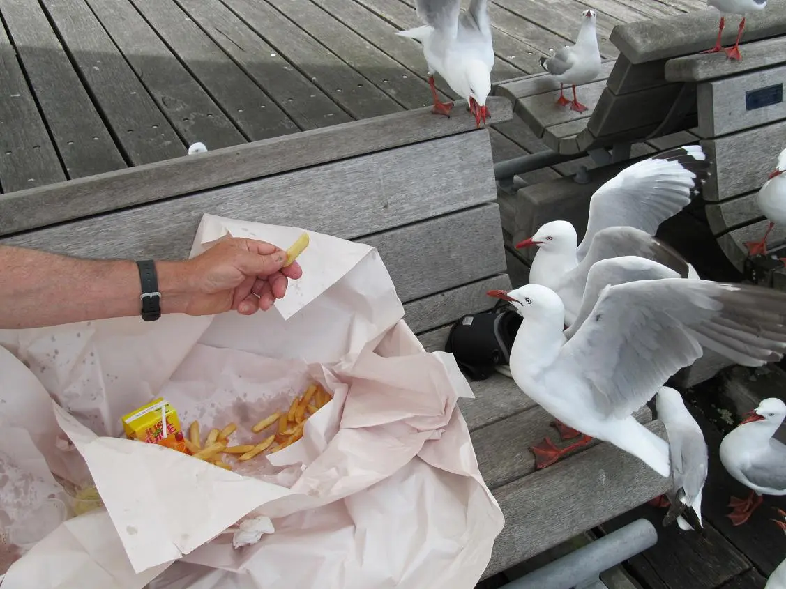Vor ein paar Tagen waren wir in der Stadt und holten uns Fisch & Chips, welche wir an der Meeres"promenade" verspeisen wollten. Natuerlich hatten wir nicht mit dem Ansturm der Moewen gerechnet, die gierig unser Essen beaeugten und versuchten, etwas abzukriegen!! Sie frassen uns foermlich teilweise aus der Hand, waehrend andere sich direkt an unseren Platz auf der Bank wagten und klauten!! :grins: Es war ein wildes Fliegen und lautstarkes Schreien um uns herum. Da wir ganz alleine dort waren, stoerte es dann auch niemanden!