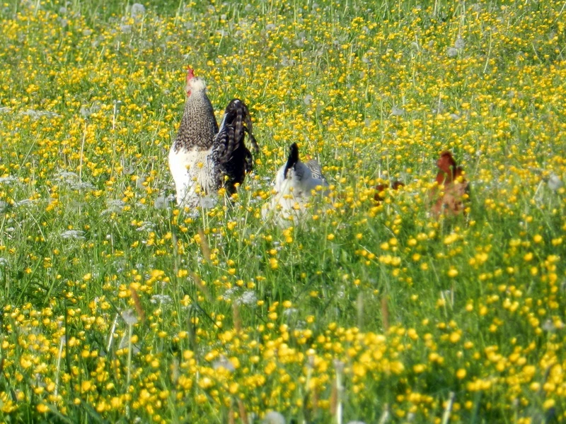 Hoffentlich hat er sie alle wiedergefunden! Tolle Wiese, da moechte ich auch Huhn sein. :grins: