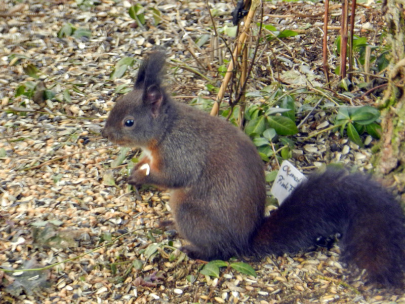 Plötzlich kam hinter dem Stamm der Blaufichte ein zweites, schwarzes Eichhörnchen hervor und wollte meinem Freund den reichhaltig gedeckten Futterplatz streitig machen.