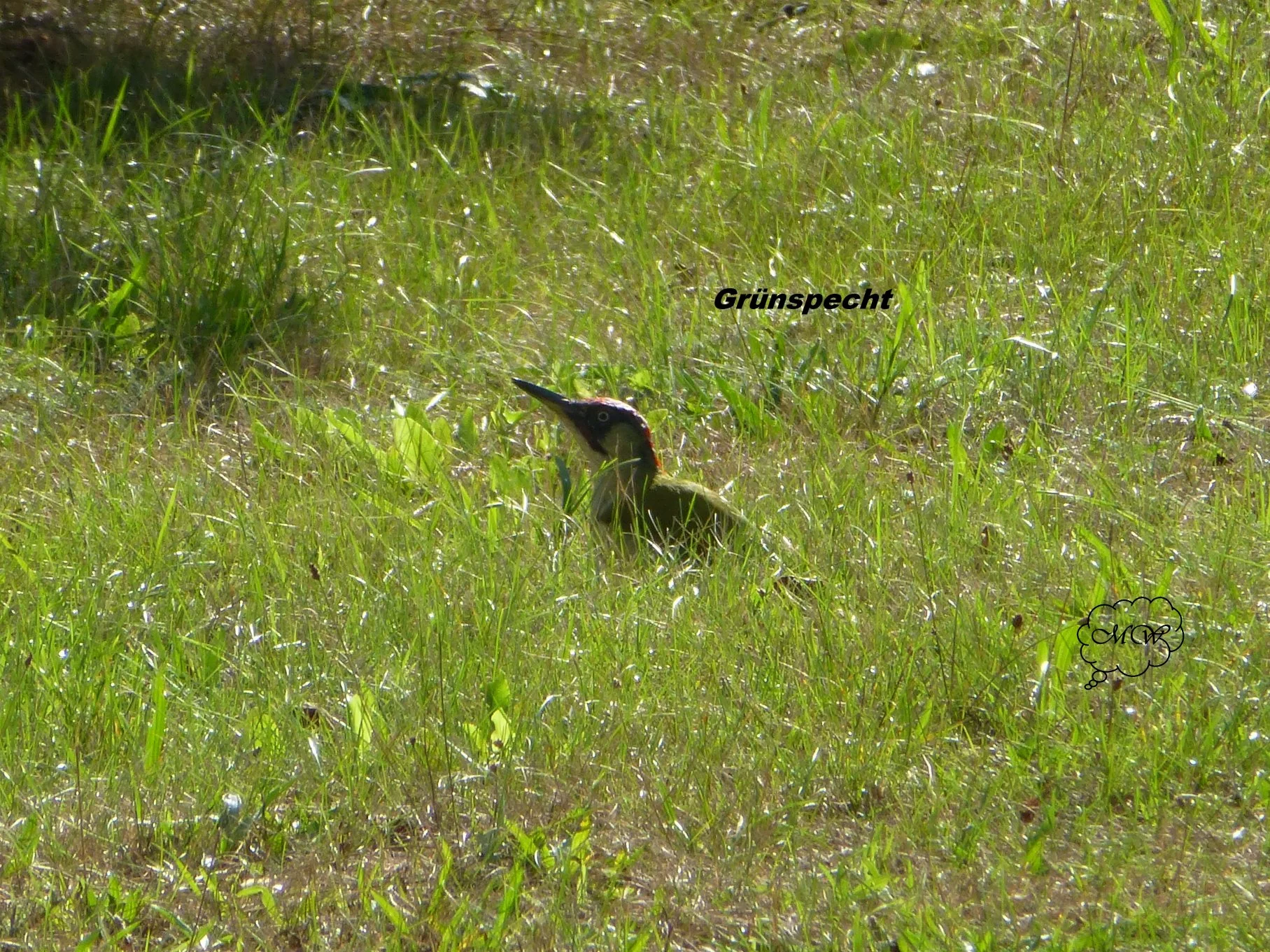 • Heute habe ich nun endlich den Grünspecht erwischt.Es ist wie ein lachen,wenn er ruft und dann suche ich ihn unten im Gras,da er Ameisen verspeist.Außerdem