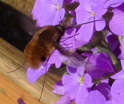 Die Wollschweber sind unheimlich schnell und der Bereich der Flügel wirkt immer unscharf. Aber auf dem einen Bild sieht man gut, dass die Art zu den Fliegen gehört. Leider parasiert der Hübsche mit seinen Eiern den Nachwuchs von Hummeln und Bienen.
