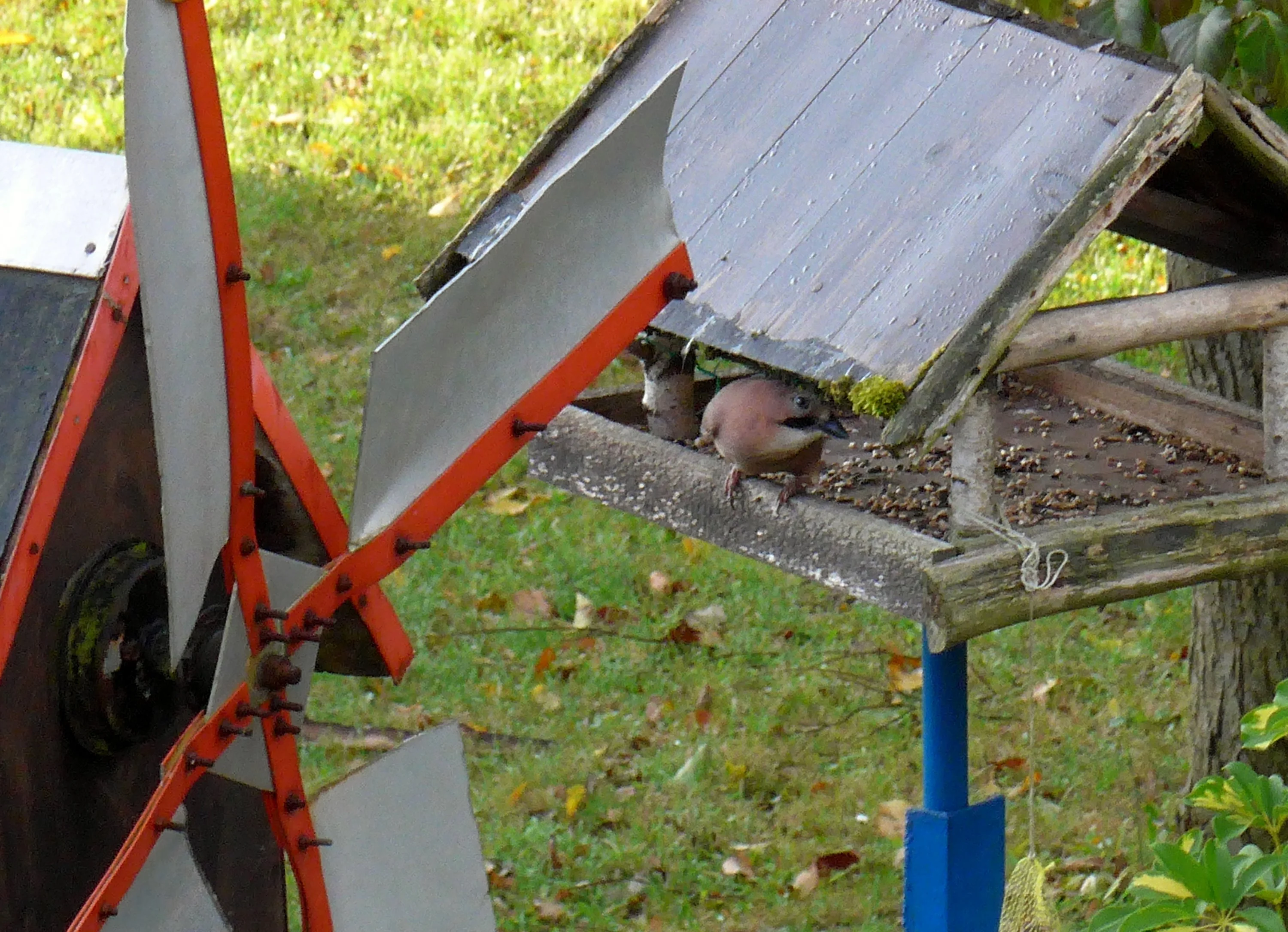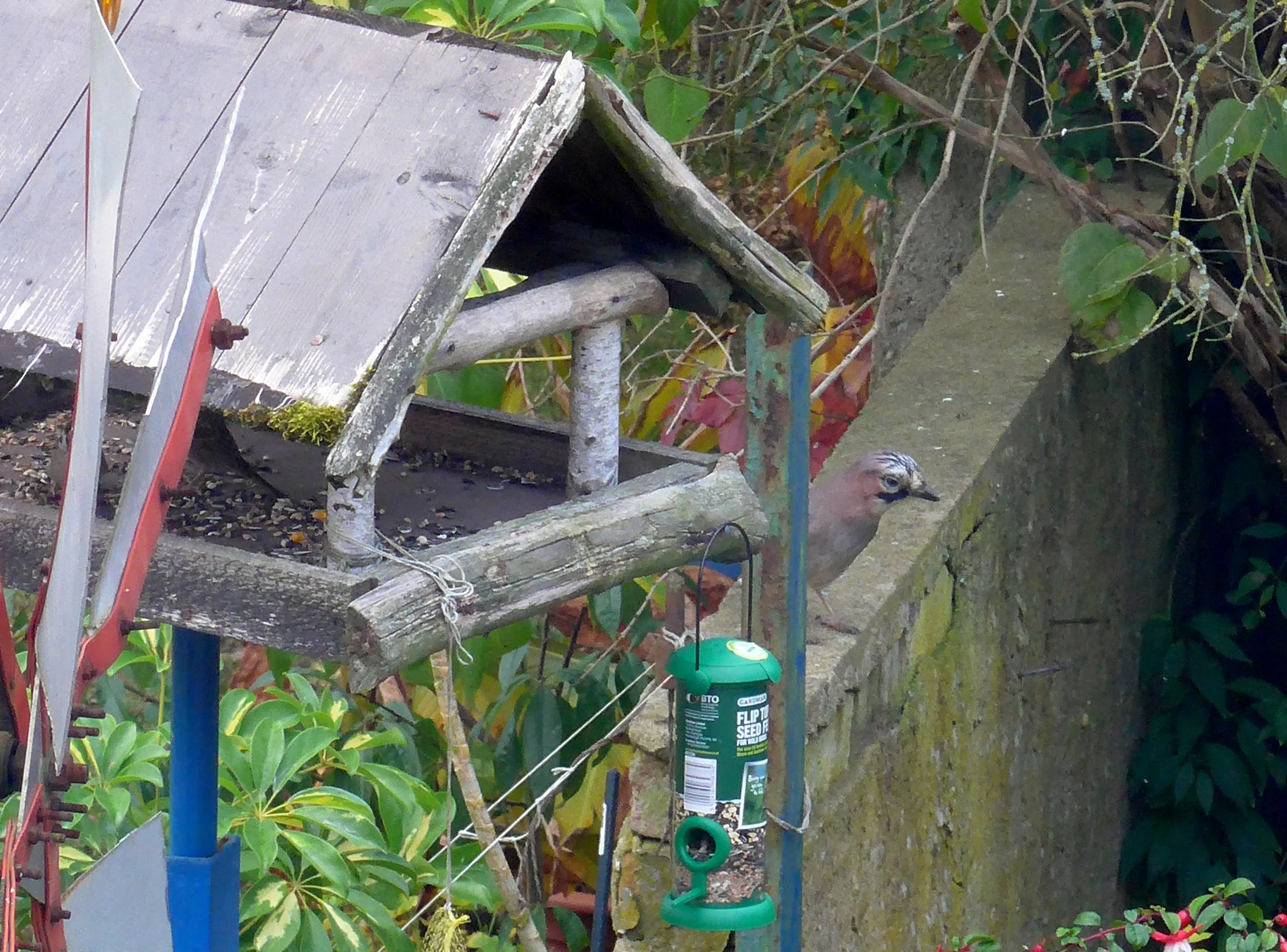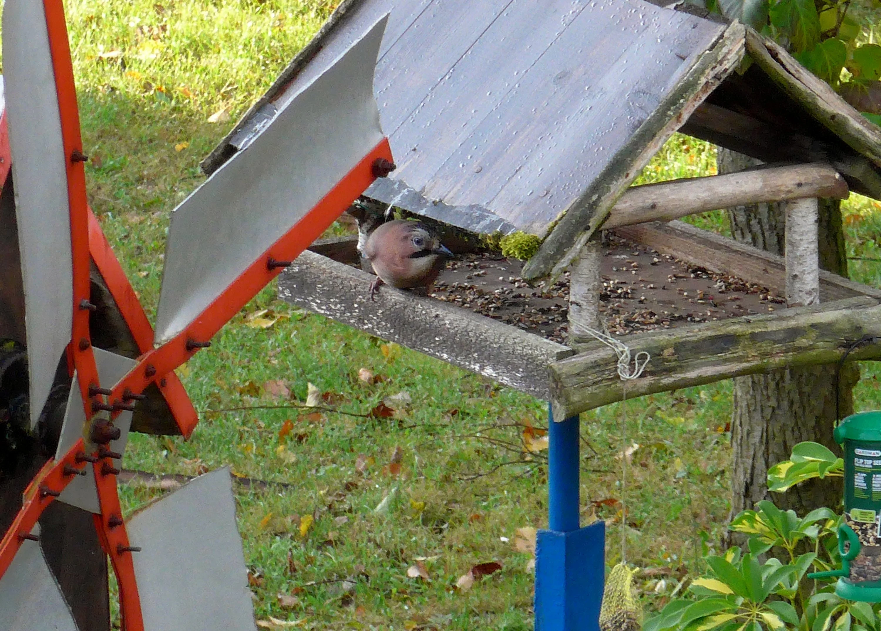 Und jetzt kommt auch der freche Oscar wieder,ein Eichelhäher der die kleinen Vögel, Kohl - und Blaumeisen verscheucht,um sich den Bauch voll zu hauen.