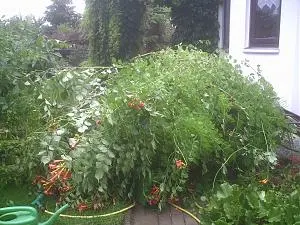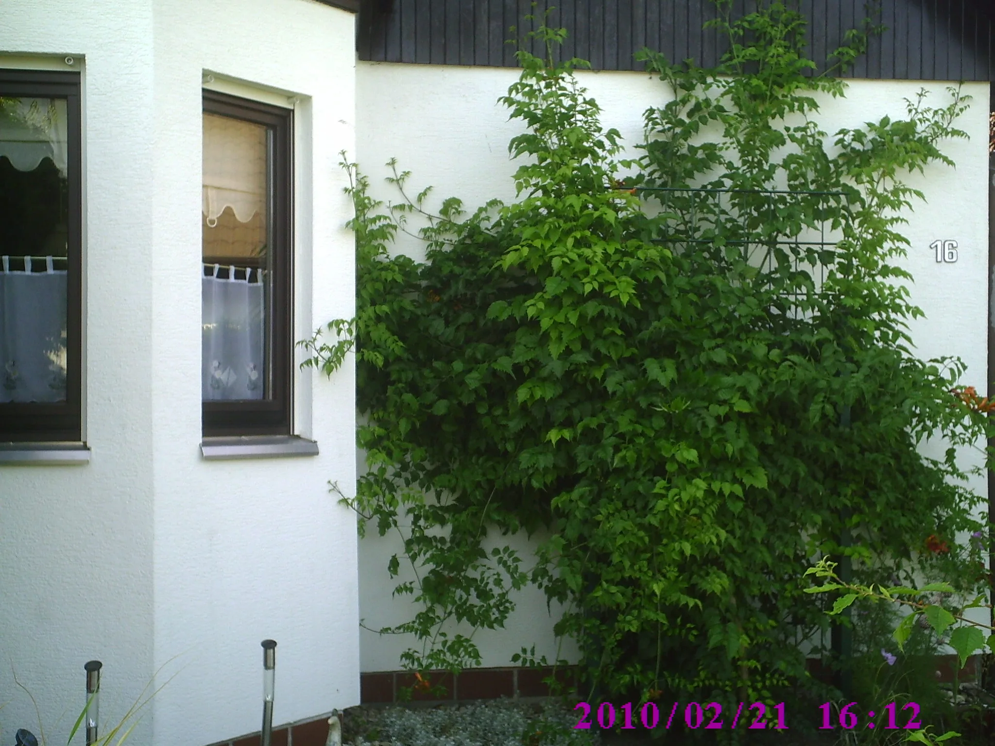 So sah es bei uns im Frühling aus. Dem Nachbars Klettergerüst ist durch Gewitter schlecht ergangen. Da musste einen neue ran, mein GG hat dann es fertig gestellt. Der Nachbar wollte die Pflanze bis zu einem Meter zurüchschneiden, Und da haben wir dem Nachbar vorgeschlagen, er solle versuchen bis an den Boden. Und jetzt treiben schon neue Triebe. Bin ich erleichtert. Die Beiden haben beinahe Ehekriese gekriegt. Nächstes Jahr ist wieder zugewachsen und blühen tut es dann auch. Und jetzt behilft sich die Nachbarin halt mit Hängendekoration. Wink.