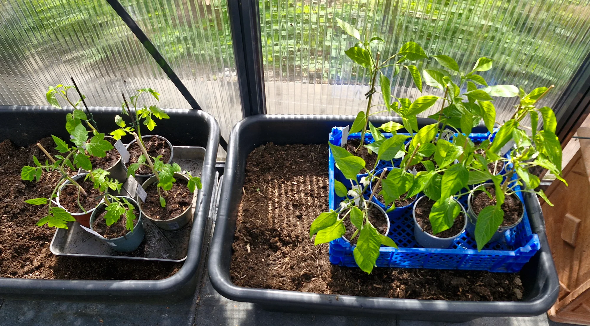 Die ersten Tomaten und Paprikas sind zum Aklimatisieren ins GW gezogen, der Rest ist noch zu klein.