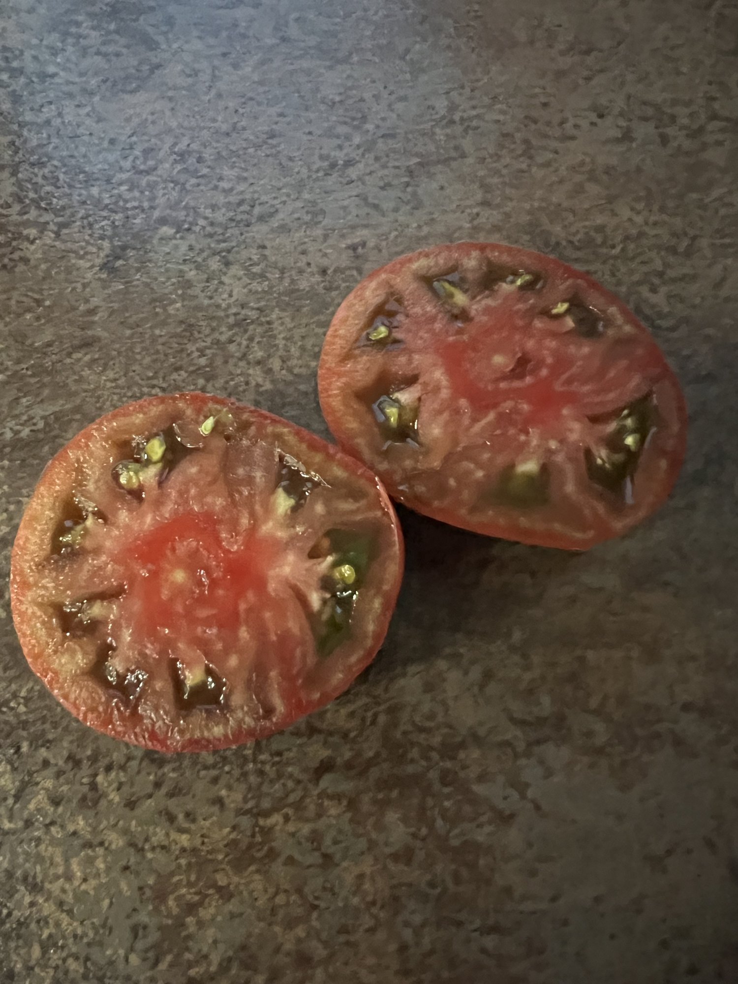 Ok, ist ein Argument.Das ist die orange Ochsenherz. Sie muß noch ein paar Tage liegen. Die hing so ungünstig, deshalb mußte sie weg.