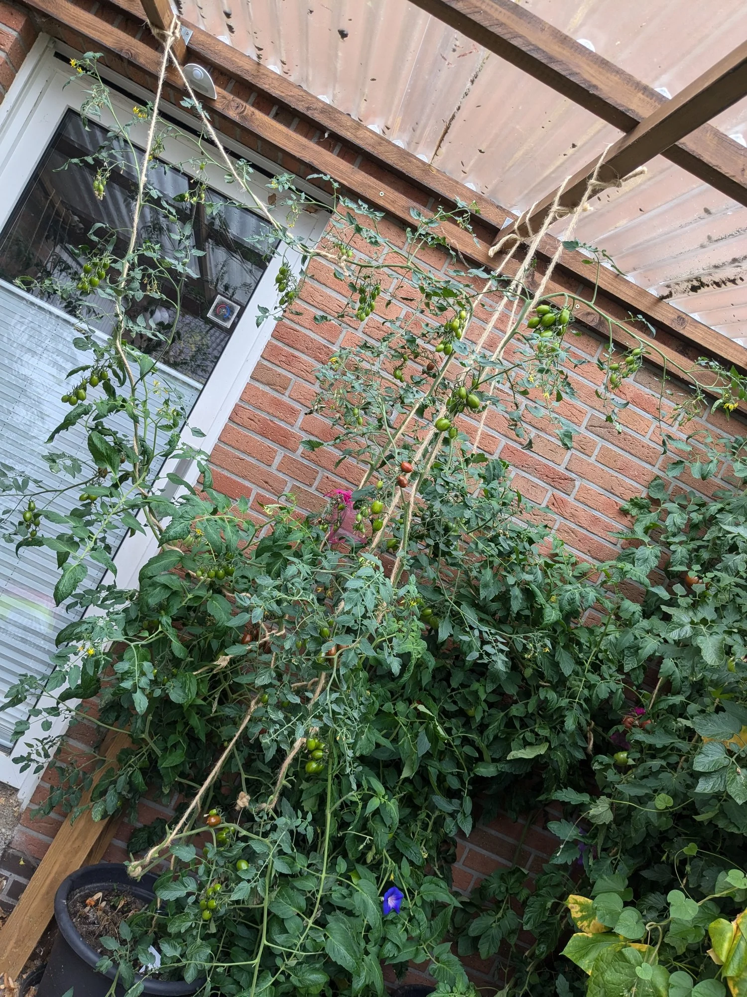 Im Beet geht es Primavera, Resi, Vivagrande, Crovarese, Sunviva und Brad‘s Atomic Grape sehr gut. Sie hängen voll und blühen weiter. Ich habe auch bei Primavera keine Made mehr entdeckt. Supersweet100 F1 hat unten einige gelbe Blattränder bekommen, aber sonst ist sie auch noch gut. Die Blätter mache ich morgen ab, wenn ich Zeit dazu finde. 42Days hat noch einiges dran, aber die Pflanze sieht nicht mehr schön aus. Die werde ich bald abernten und entsorgen. Und Turmalin hängt voll, hat aber kaum noch Blätter. Der Geschmack der Früchte von Turmalin ist langweilig, wie Supermarkttomsten, aber mit so wenigen Blättern wundert es mich auch nicht.Mal eine andere Frage... wie ist es denn so allgemein um den Zustand eurer Pflanzen bestellt..?
