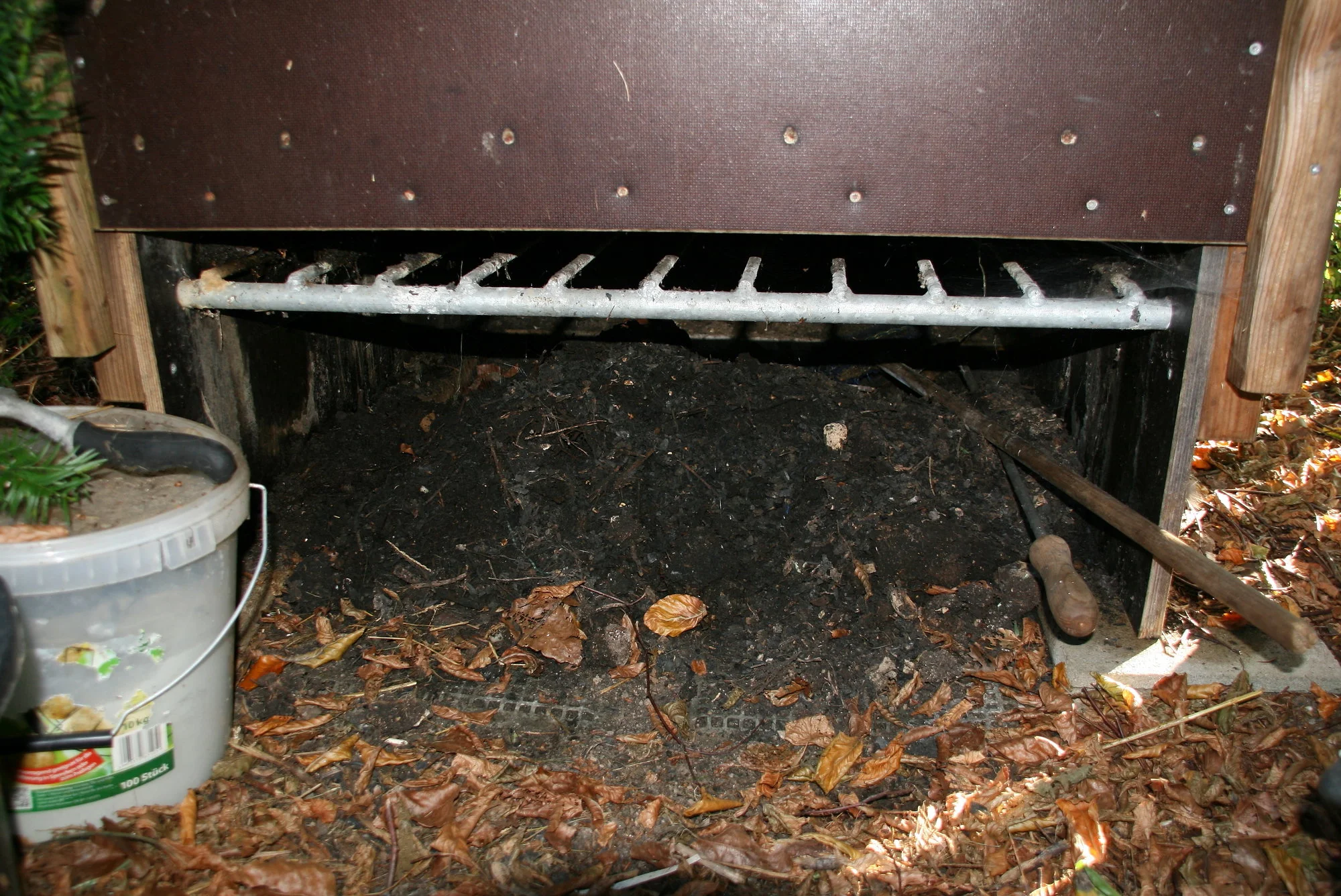 Die Holzkohle bekomme ich von einem Freund, der eine Holzgaserheizung hat, da fällt das als Abfall an. Auf dem letzten Bild sieht man unten die fertige Terra Preta. Jetzt liegt schon wieder soviel unten, das ist eine wahre Freude, wenn ich das dann überall verteilen kann. Zuerst kommt immer der Gemüsegarten dran, dann die Staudenbeete.