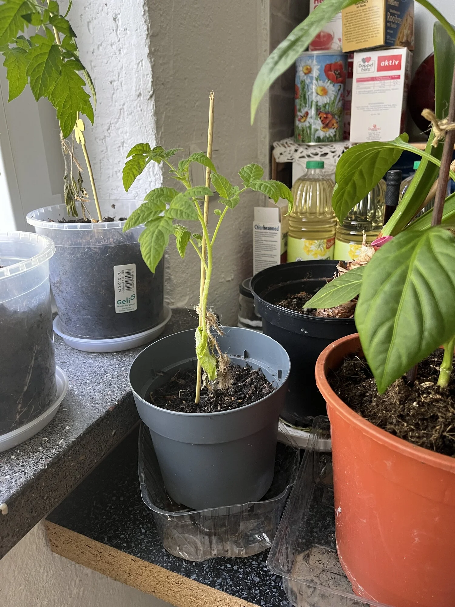 Die andere Sorte nennt sich Longlife Tomate CINDEL F1, da sind die unteren Ästchen auch schwächer. Wurden jetzt schon 2 der untersten Ästchen abgeworfen. Aber die bilden ordentlich Wurzelwerk.