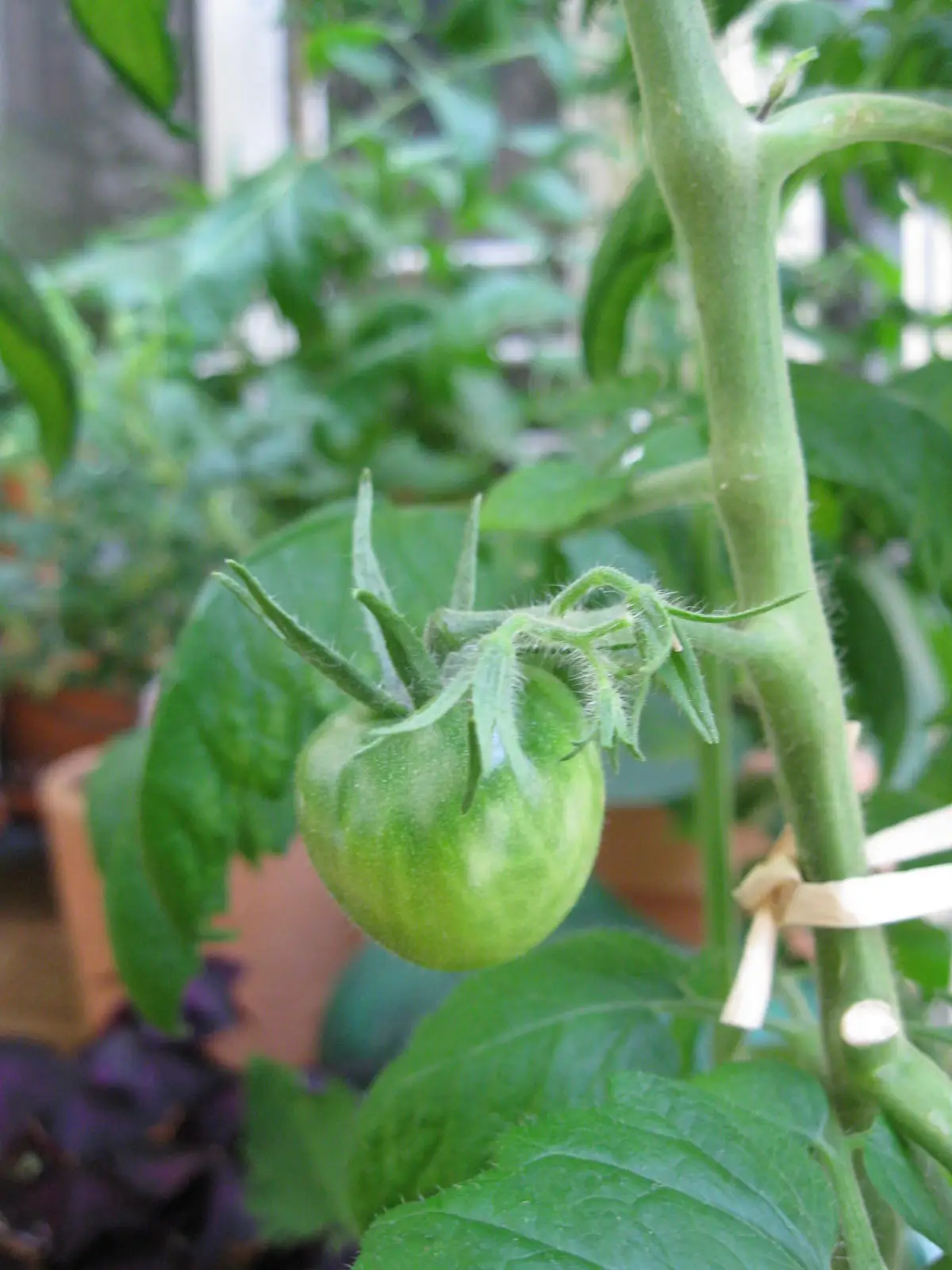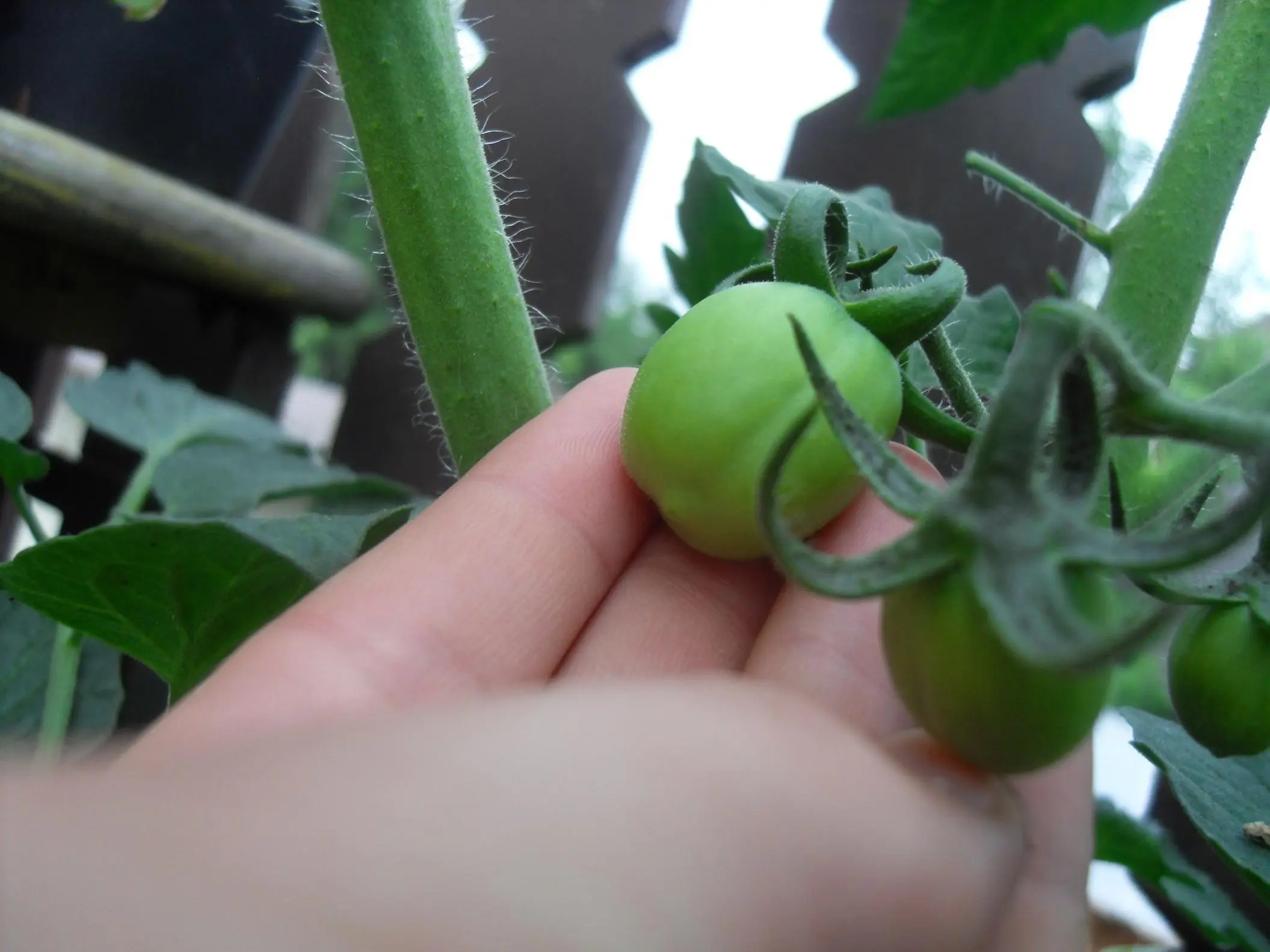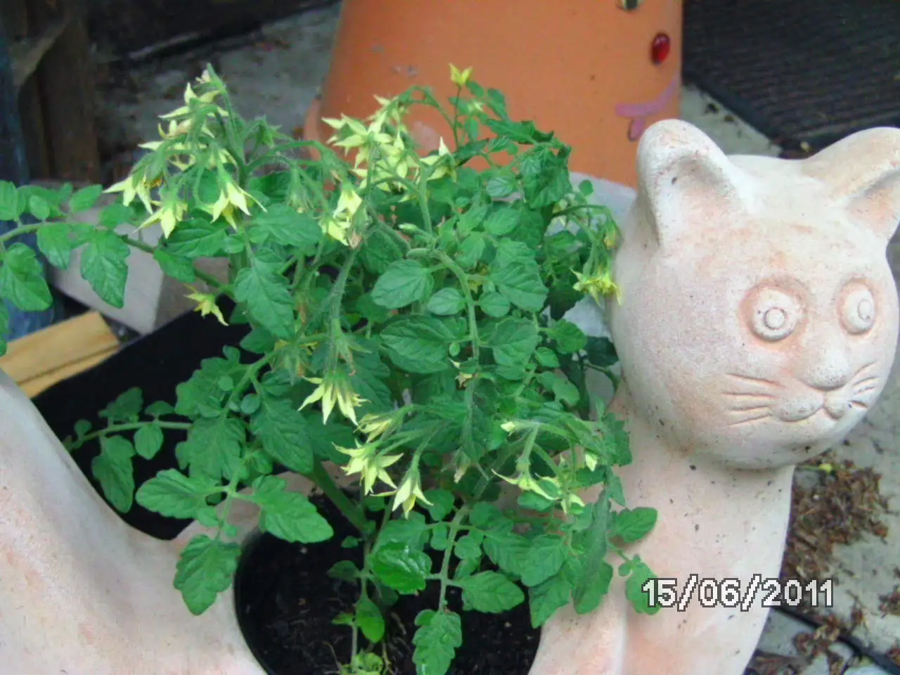 So, da hätten wir als erstes meine Buschtomate, dann zweimal Fülltomate unbekannter Sorte.