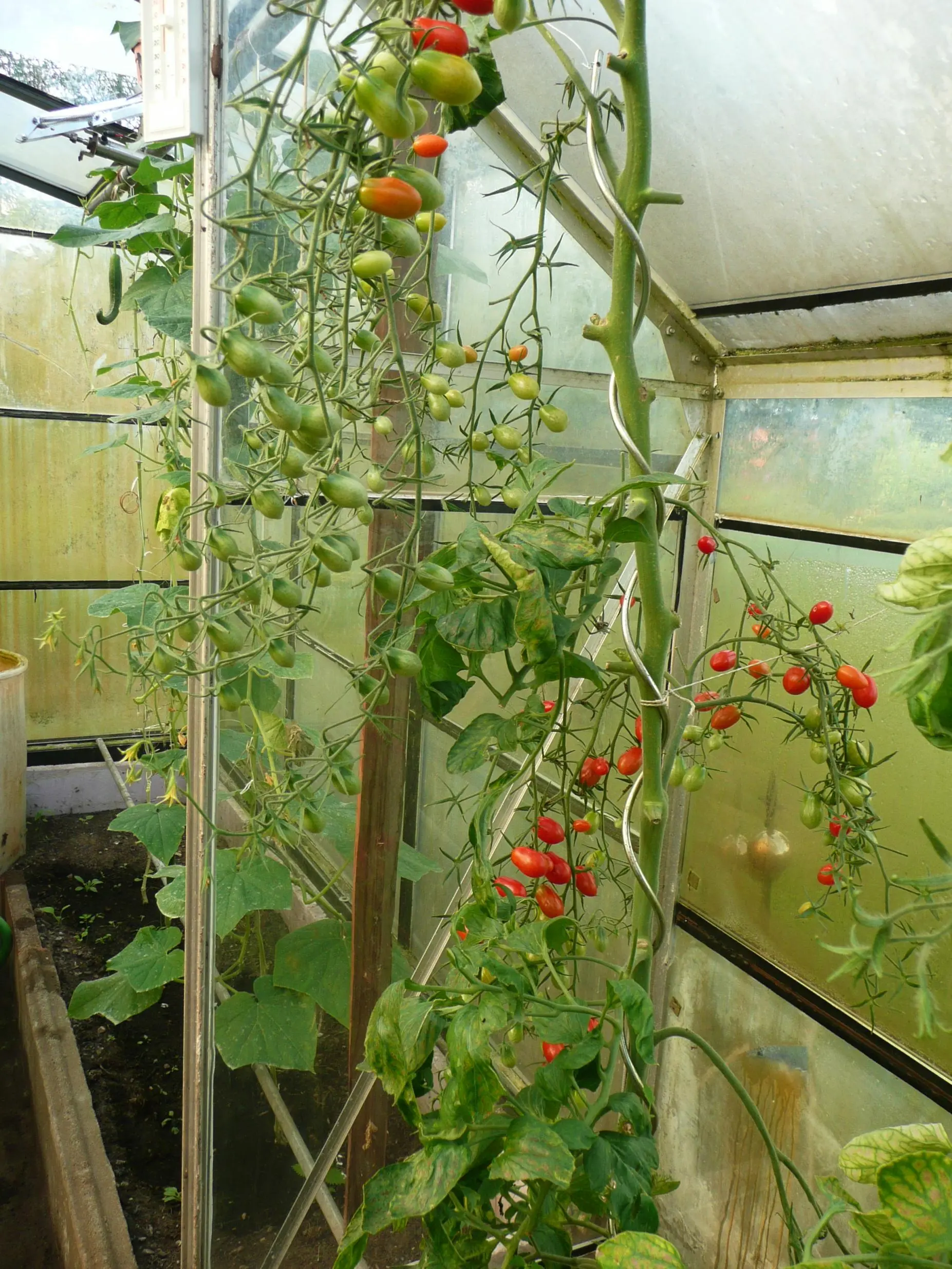 2 x Harzfeuer, 1 x Tangella (wunderschöne Farbe, finde ich), 1 x Tumbling Tom Junior Yellow und ein paar Cherrytomaten, wobei ich nicht weiß, welche es sind. Eigentlich sollte es eine Tigerella und eine Green Grapes sein. Naja... Altersdemenz, an der Tigerella erfreut sich wohl ein anderer. Eine würde ich schätzungsweise für die Sweet 100 halten, weil sie endlose lange Rispen hat. Beide sind aber sehr lecker (ist ja auch was wert).