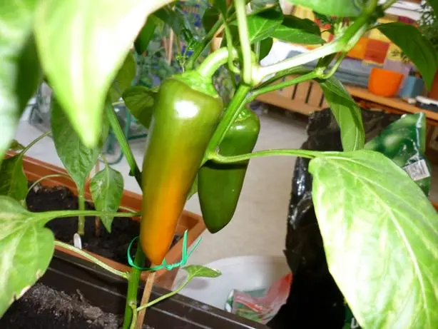 Ich habe, ehrlich gesagt, gedacht, die nehmen NIE Farbe an. In diesem grünen Stadium waren sie seit ca. 6 Wochen. Und knochenhart. Da ich die Samen aus Supermarkt-Snackpaparikas gepuhlt hatte, ahnte ich böses. Hat sich dann aber anscheinend in Wohlgefallen aufgelöst. Aber wer weiß? Vielleicht sind sie trotzdem ungenießbar. Versuch macht kluch.