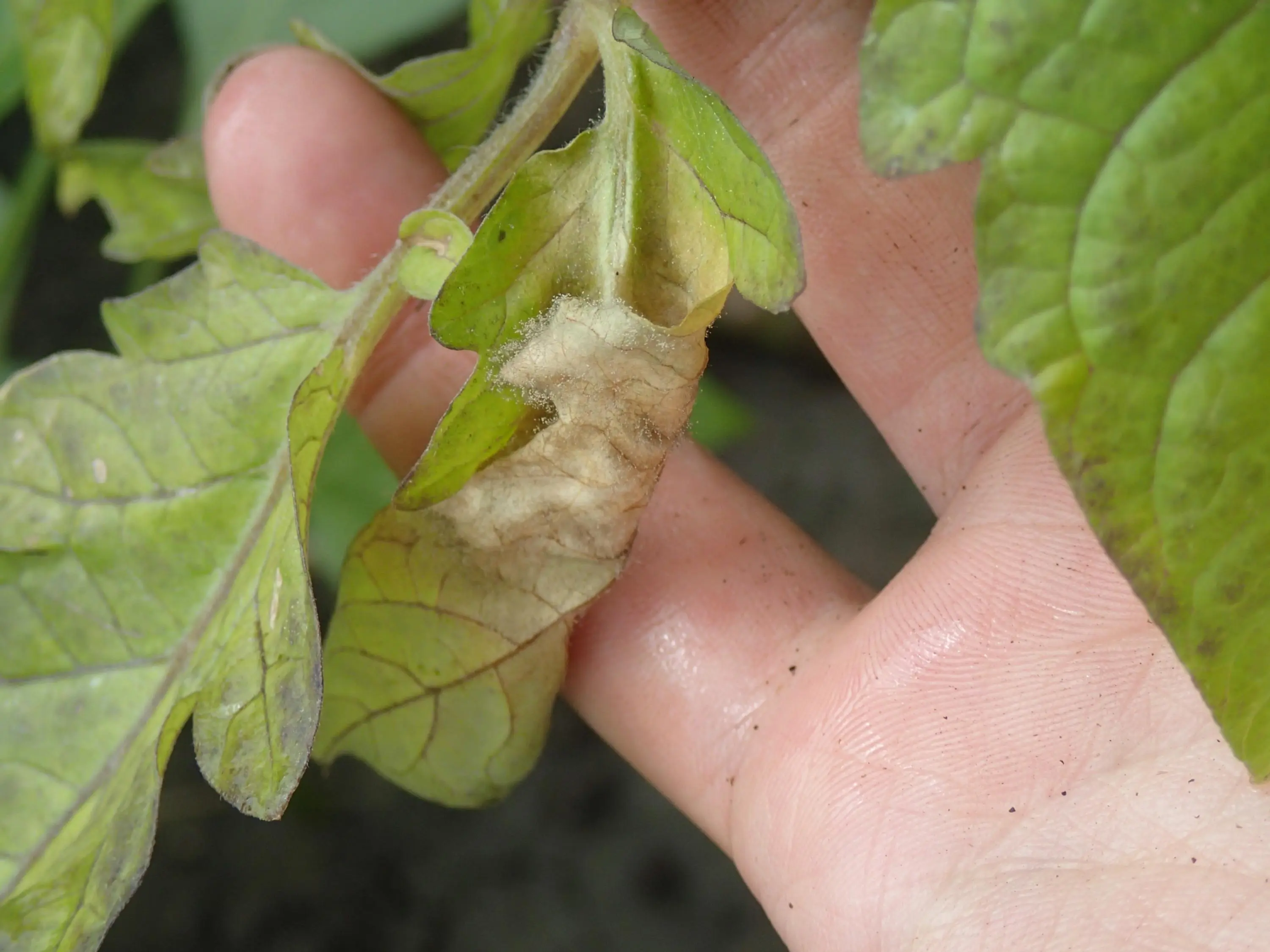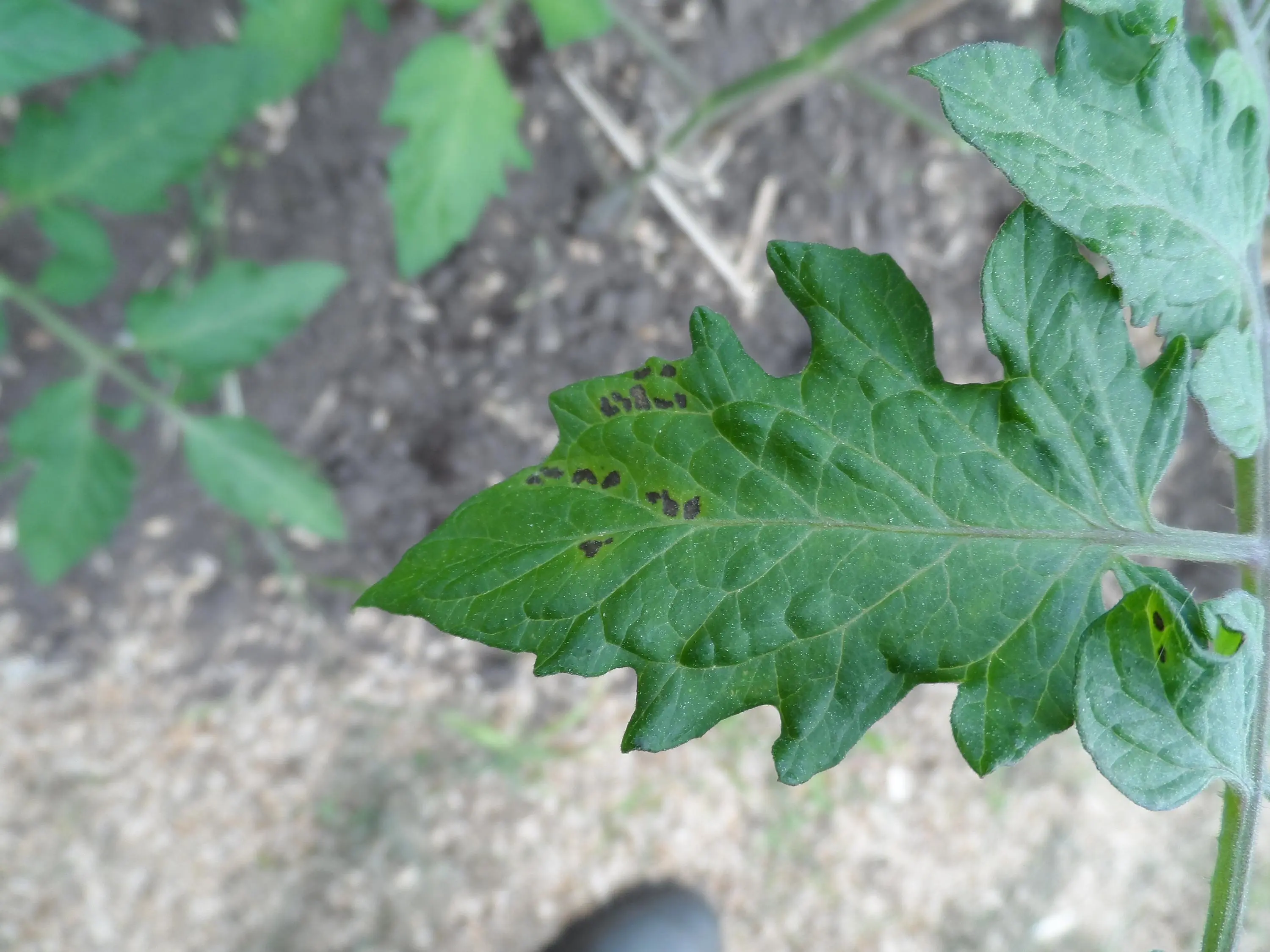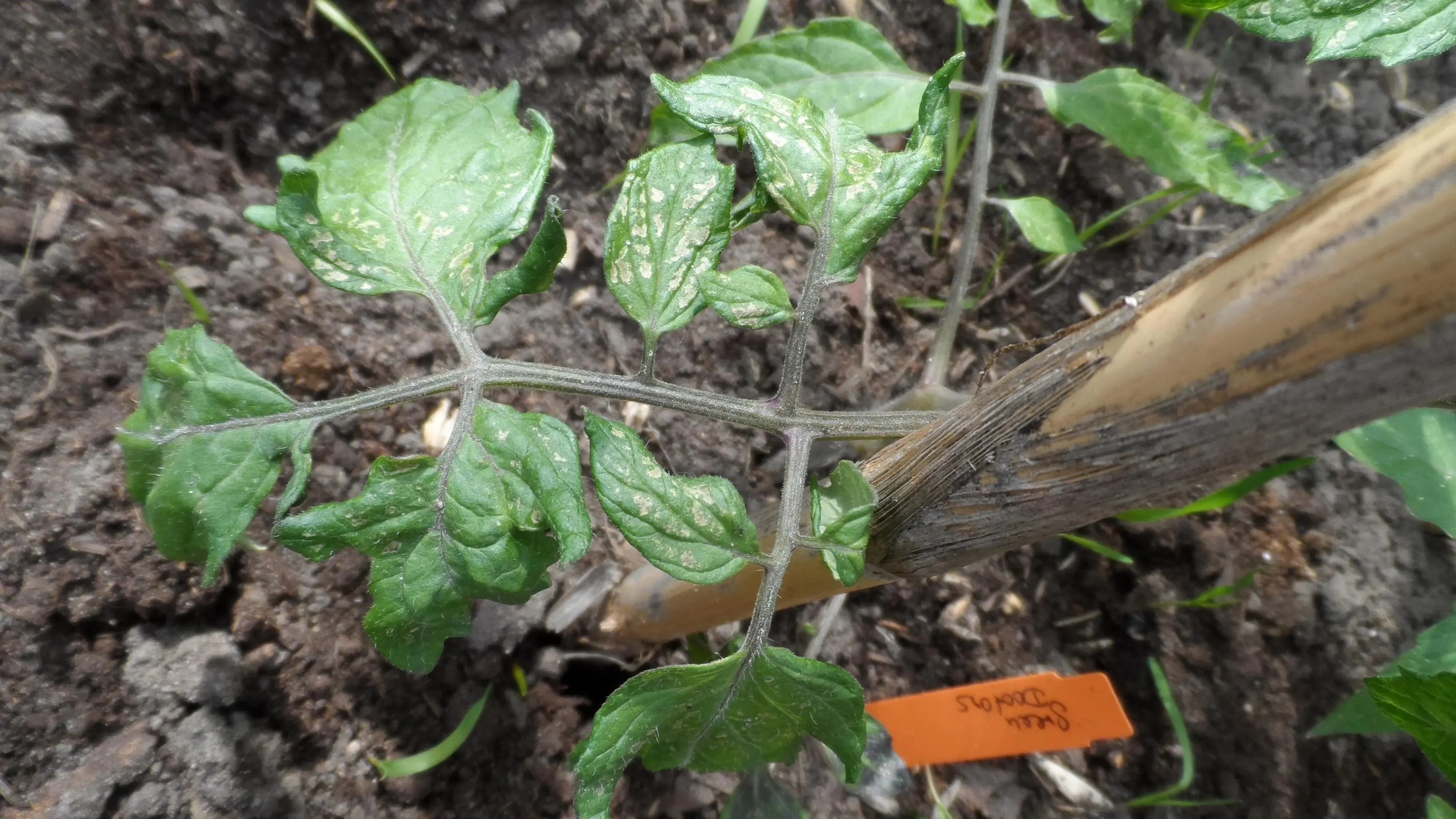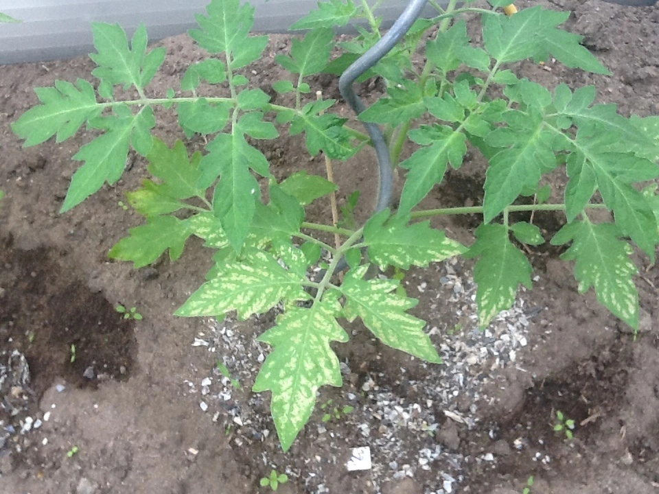 Hier nochmal 3 Fotos von Tomatenpflanzen, die nach den kalten Nächten ein anderes Schadbild zeigen. Irgendwie sieht mir das "verdächtig" aus...