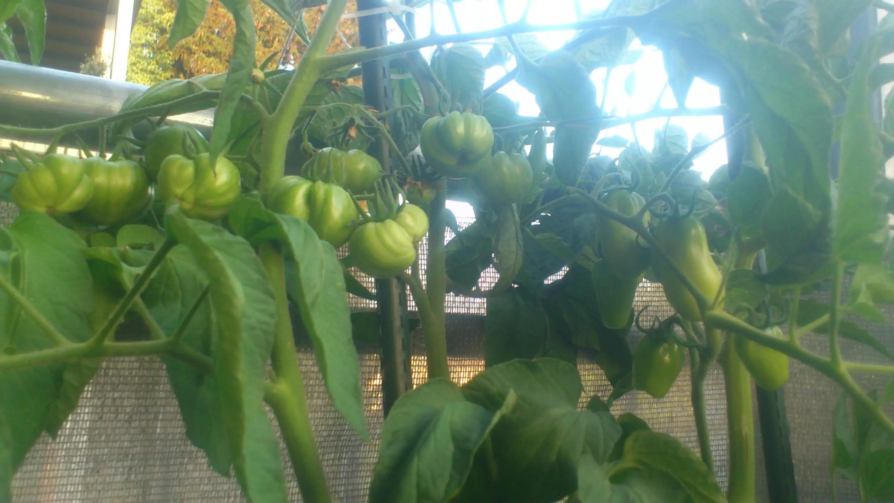 Ich habe gestern meine Tomaten im halboffenen GWH geknipst. Wo noch keine Früchte mit auf dem Foto sind, hängen noch keine dran. "Black Zebra" und "Green Zebra" hab ich doppelt, und eine namenlose gelbe Cocktailtomate mit Eierfrüchten ist auch dabei.