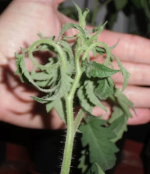 Das ganze Blatt rollt sich nach unten schneckenhausartig zusammen. Dies entsteht durch sehr hohe Einstrahlung bei einer jungen Pflanze bis zur ersten Fruchtbildung. Durch das viele Licht bildet die Pflanze mittels Photosynthese sehr viel Kohlenhydrate, die nicht in die Früchte eingelagert werden können. Sie bleiben in den Blättern und werden durch die Veratmung in der Nacht nicht vollständig verbraucht. Dieses Symptom kann meist bei gut versorgten Pflanzungen ab März im Treibhaus beobachtet werden. Zu dieser Zeit werden in unseren Breiten (Süddeutschland + Schweiz) durchaus Einstrahlungsstärken von 600-850 W/m² erreicht. Damit die Pflanze durch Blattrollen nicht gehemmt wird erhöht man die Nachttemperatur und damit die Veratmung, den Abbau von Kohlehydraten zu CO2. Oder man nimmt ein halb ausgewachsenes Blatt aus dem Kopfbereicht und vermindert so die Einlagerung von Kohlehydraten. Sobald das Fruchtwachstum beginnt werden die Kohlehydrate vermehrt in die Früchte eingelagert und das Blattrollen verschwindet.