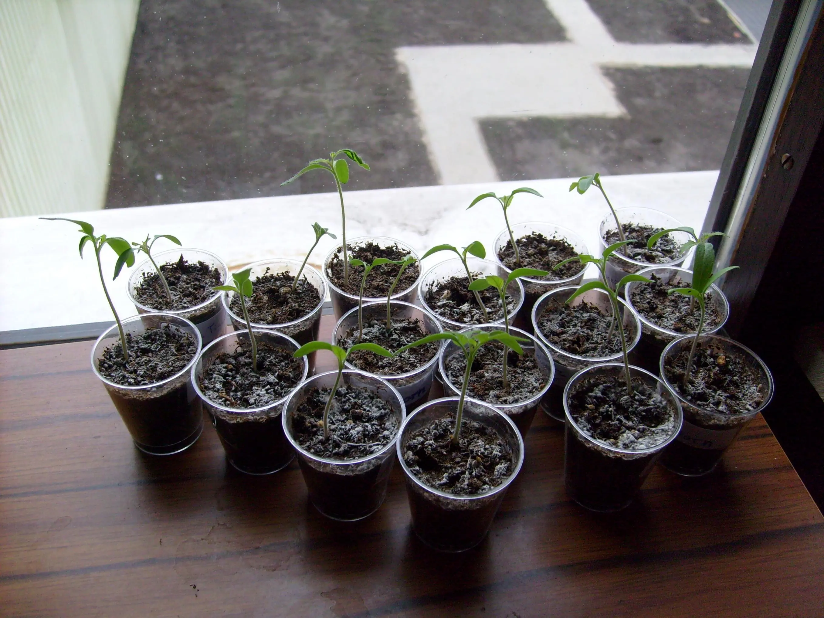 Gesät wurden alle am 22. Februar je 3 Samen pro Schnapsbecher. Gekeimt waren alle innerhalb von 9 Tagen. Nur der stärkste Keimling pro Becher durfte weiterwachsen.