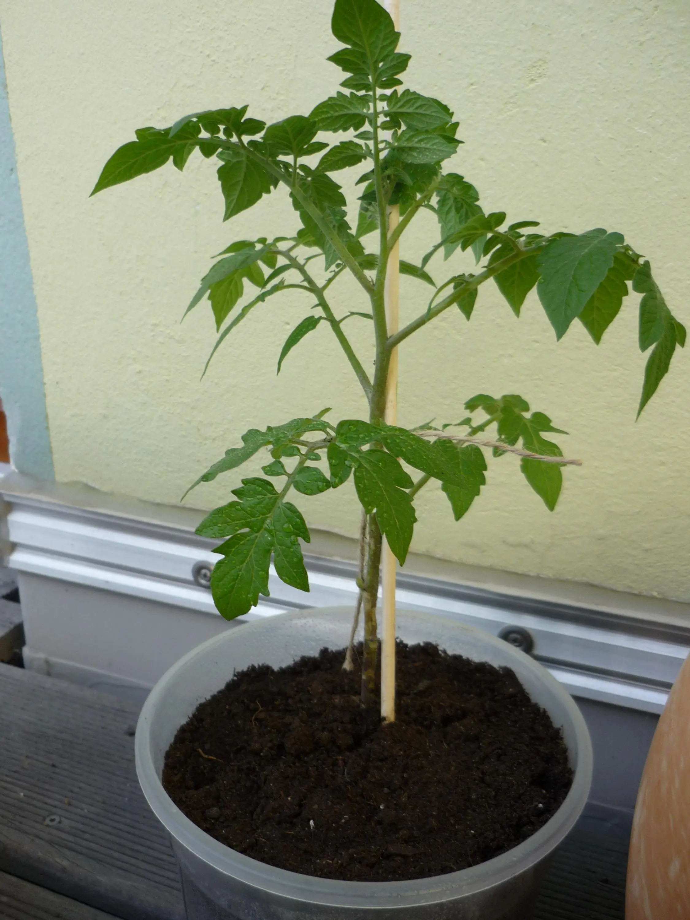 (PS: Die Tropfen auf den Blättern kommen gerade vom Einsprühen mit diesem Backpulver-Mix, was ich hier im Forum gegen Pilzbefall gelesen habe - die Blätter sind sonst nicht nass.)