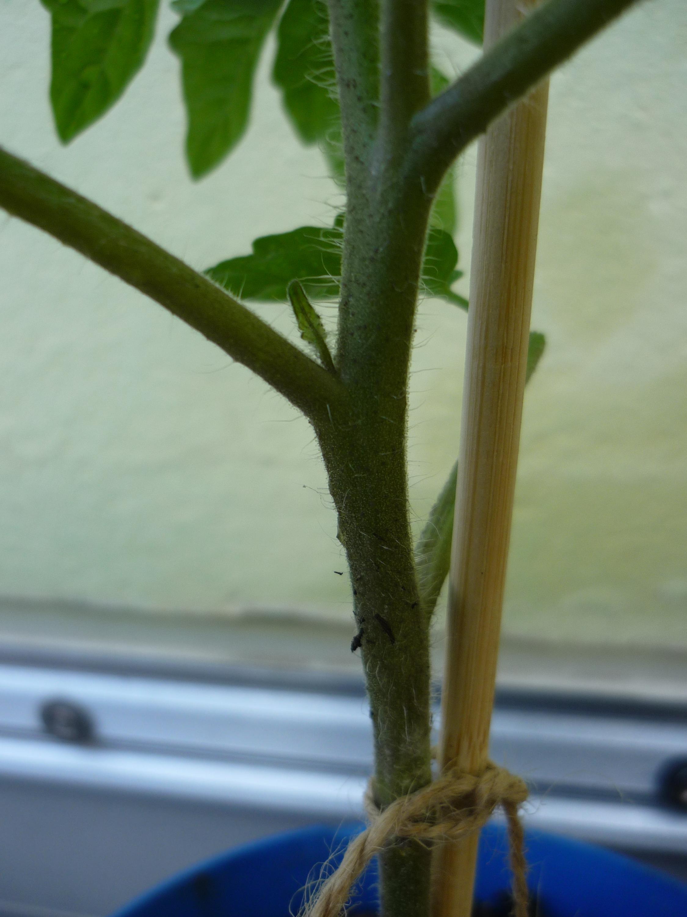 Meine Kamera ist leider nicht besser. Ich habe festgestellt, dass die betroffenen Tomaten überall am Stengel, vor allem oben, wo die Schadstellen noch nicht so ausgeprägt sind, lauter kleine schwarze Pünktchen haben, und zwar dort, wo die Härchen wurzeln. Leider ist das Bild sehr dunkel, aber vielleicht kann man die Pünktchen erahnen: