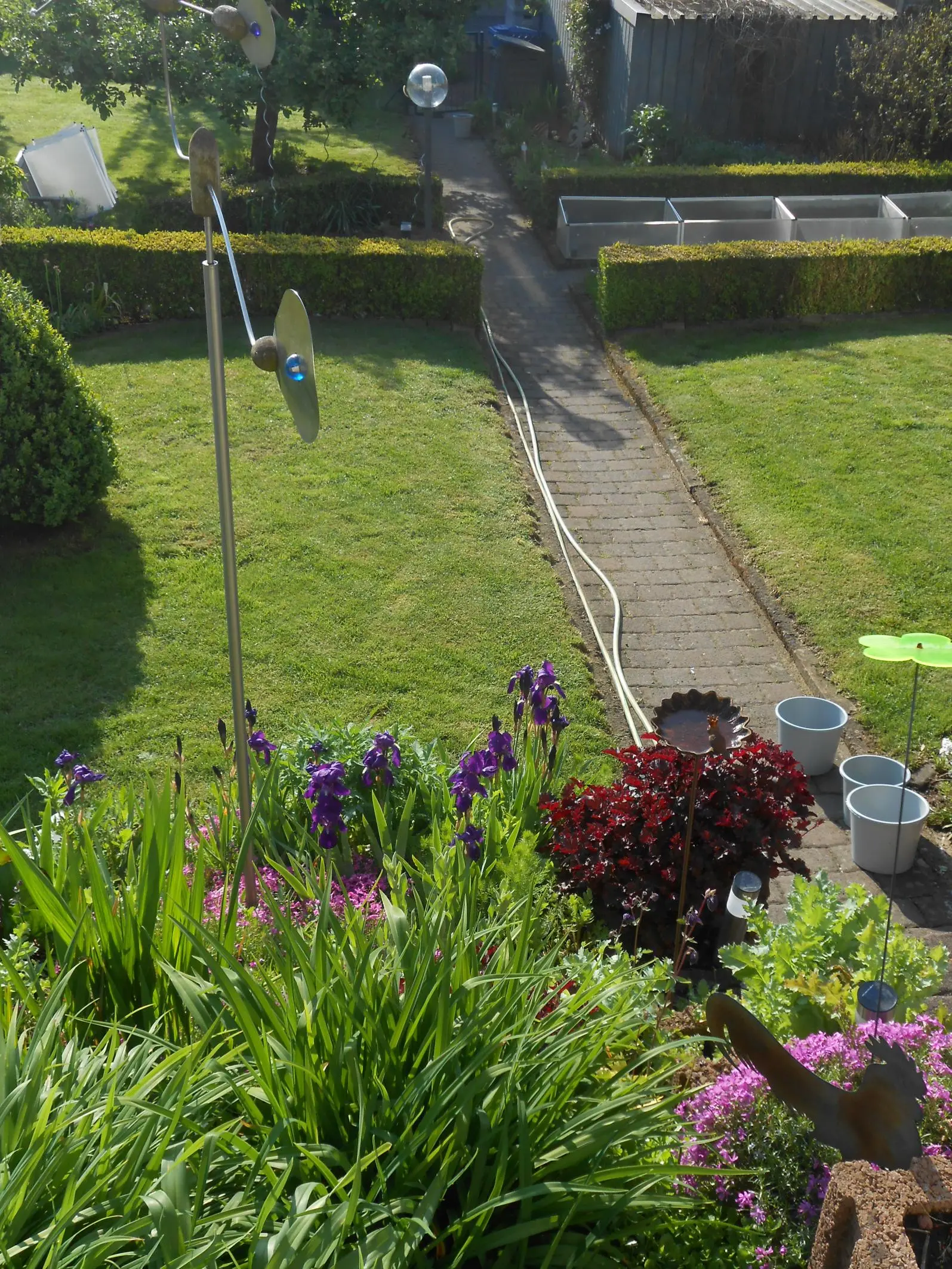 Deshalb sieht man rechts das blaue 200ltr Fass, den gelben Bewässerungsautomat und die Rohre. Früh um 6 und abends um 6 laufen jeweils 18 ltr direkt an die Wurzeln.