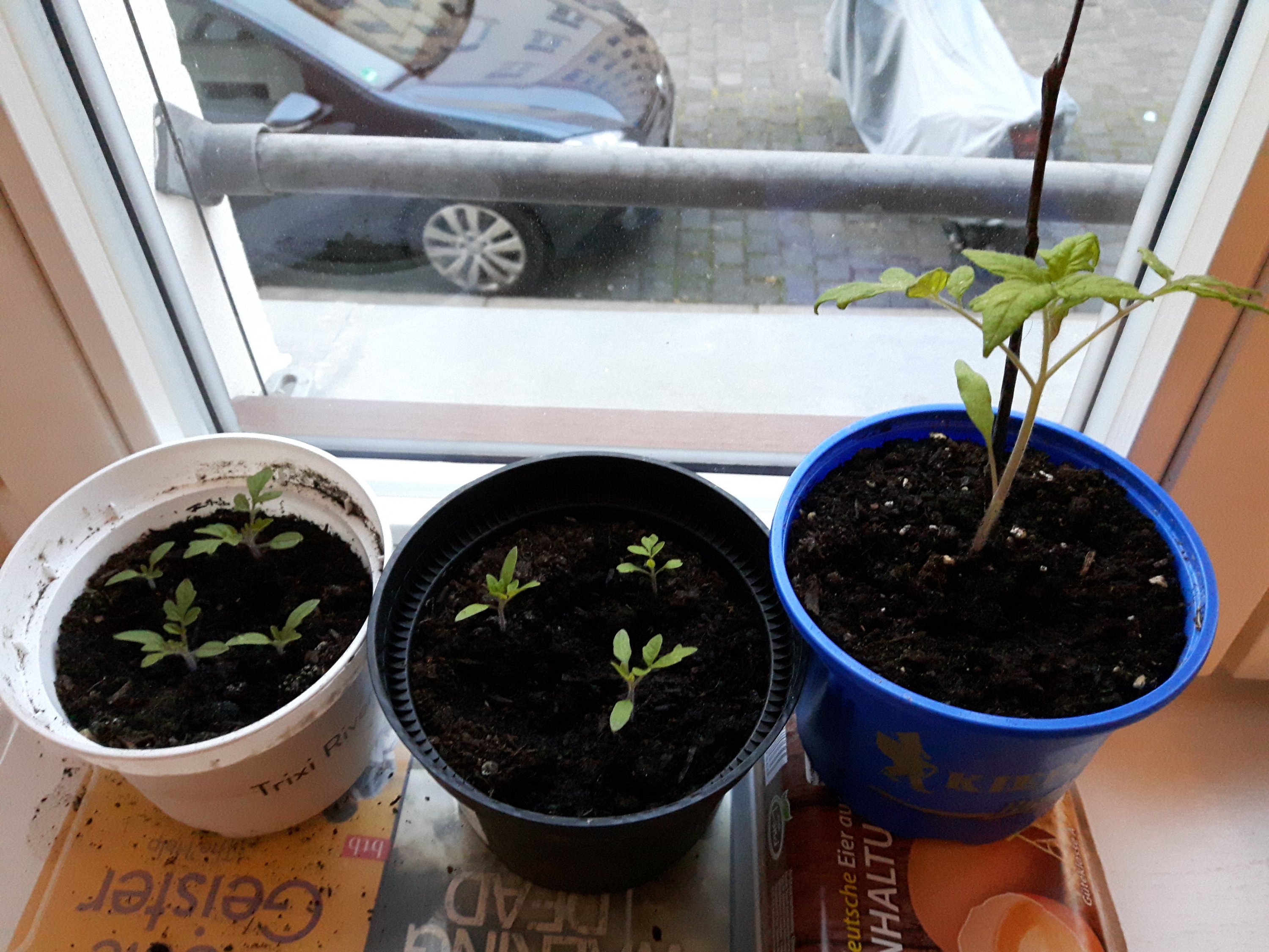 Seit meinem letzten Beitrag hat sich ein bisschen was getan, auch wenns trotzdem mehr sein könnte. Immerhin sehen die Pflänzchen dank eurer Tipps schon gesunder aus. Weils hier momentan um den Nullpunkt ist und nachts Minusgrade hat, stehen sie erstmal drinnen, bis es wieder wärmer wird. Die kleinen werde ich die Tage auch noch in einzelne Töpfe setzen.