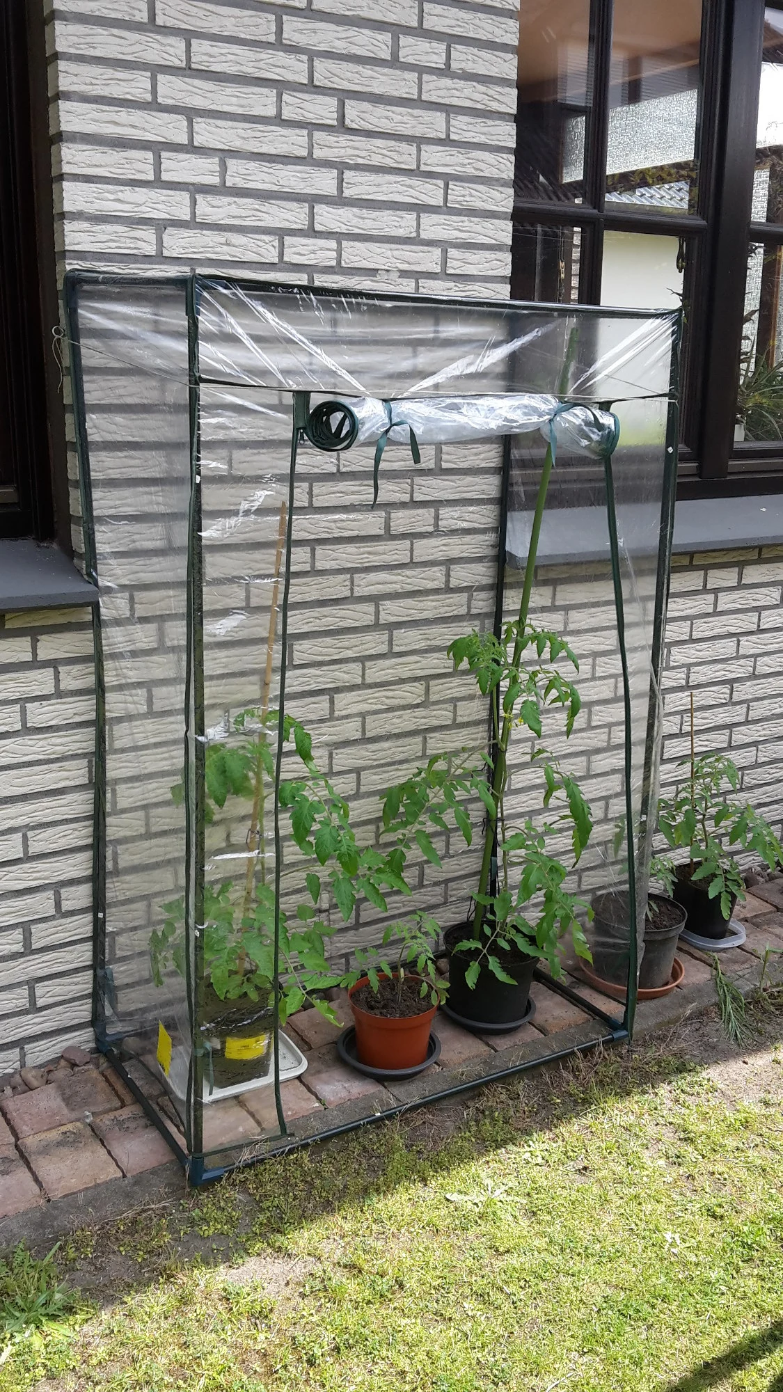 Das Häuschen ist zur Anzucht ganz schön. Aber im Sommer veschmoren sie darin. Es ist auch zu niedrig. Es scheinen alles Stabtomaten zu sein, da habe ich schon was zu geschrieben. Große Töpfe, ausgeizen, Langzeitdünger. Dann brauchst Du eigentlich nichts nachzudüngen, der hält für 5 Monate.