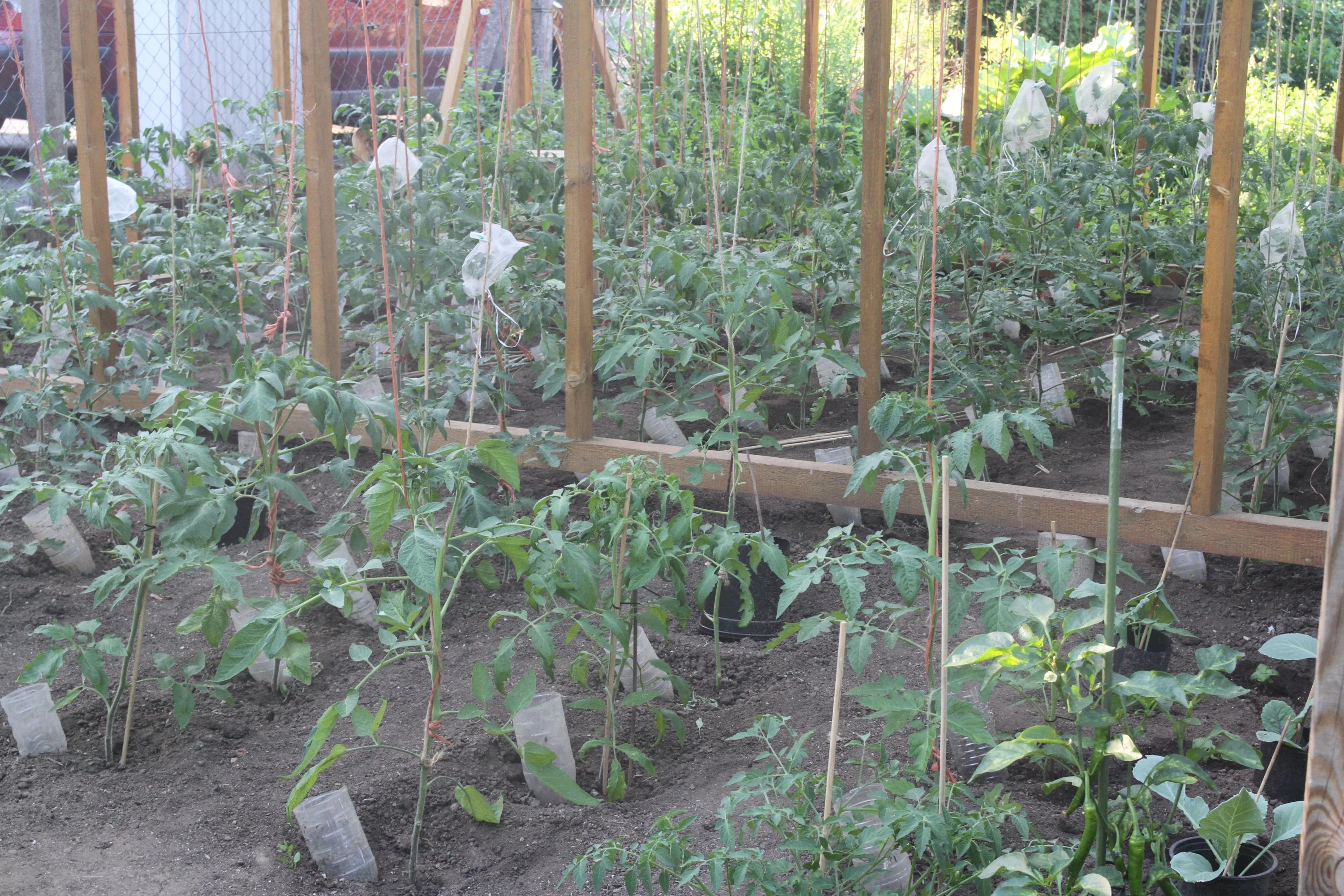 Die Pflanzen werden ordentlich an den Rohren angebunden. Da rutscht nichts nach unten weg.