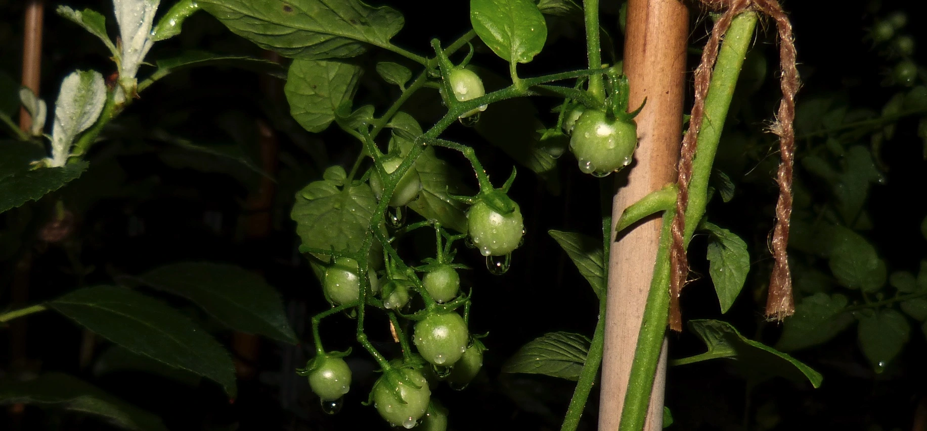 Eine Johannisbeertomate, die ich frei im Wildbeet gepflanzt habe, wurde komplett von den Schnecken zerfressen, ich hab 2 Tage nicht geschaut, schwups, weg. Jani-Tomaten stehen auch auf dem Schneckenspeiseplan, da muss ich ständig pflücken gehen. Eine andere JBT habe ich spaßeshalber in einen Baum gehängt (Hängeampel) und die rankt sich jetzt an den Ästen entlang und hat ein paar Miniblüten. Aber einige Blätter sehen nicht so dolle aus, sie haben braune Flecken.