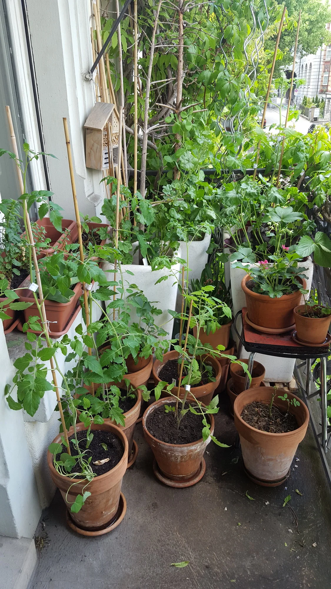Drinnen: Balkonzauber (der ihr zugedachte Topf ist von blühender resp. bereits tragender Erdbeere besetzt und brachte es nicht übers Herz sie (in kleineren Topf) umzusetzen ;-), Moneymaker und mex. Honigtomate - mal schauen