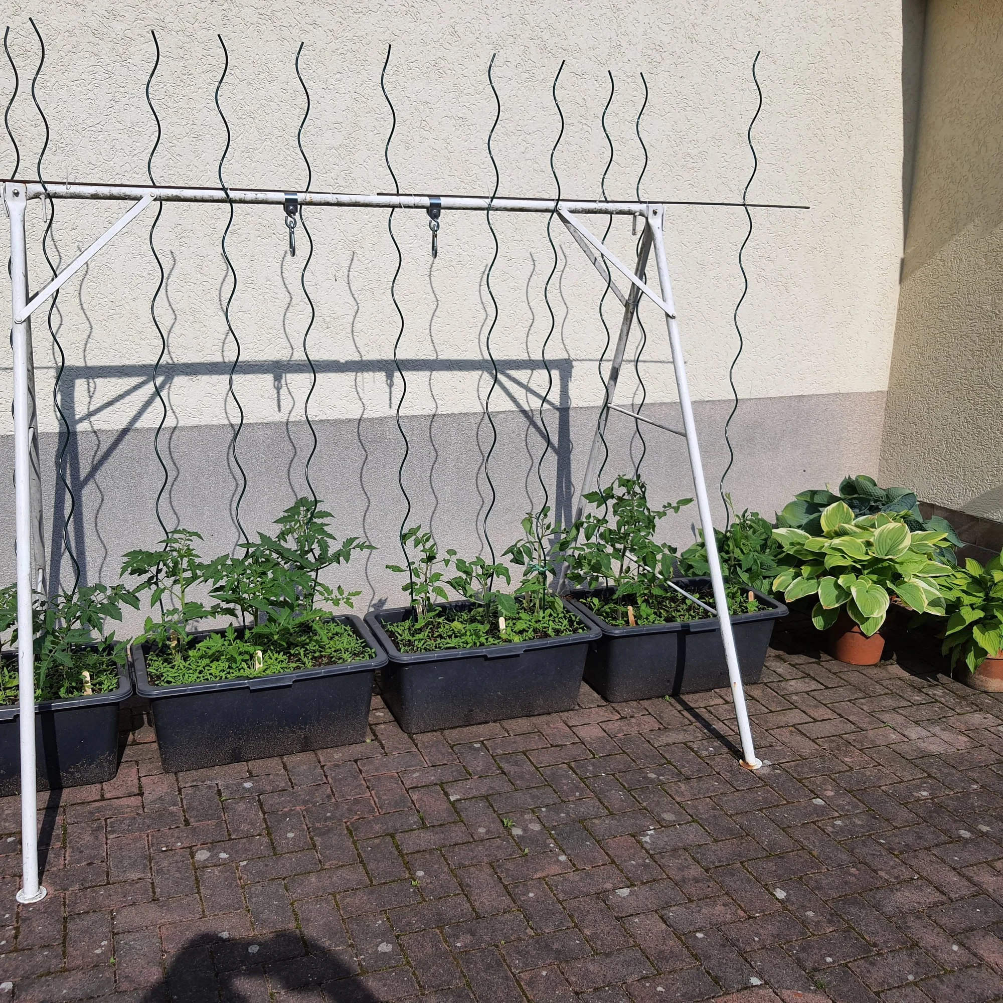 @pflanzenralle, in 4 Speiswannen à 90 Liter. Die Tomatenpflanzen stehen nicht in einer Zeile, sondern gegeneinander versetzt, insgesamt gesehen also im Zickzack. So haben sie den größtmöglichen Abstand von einander.