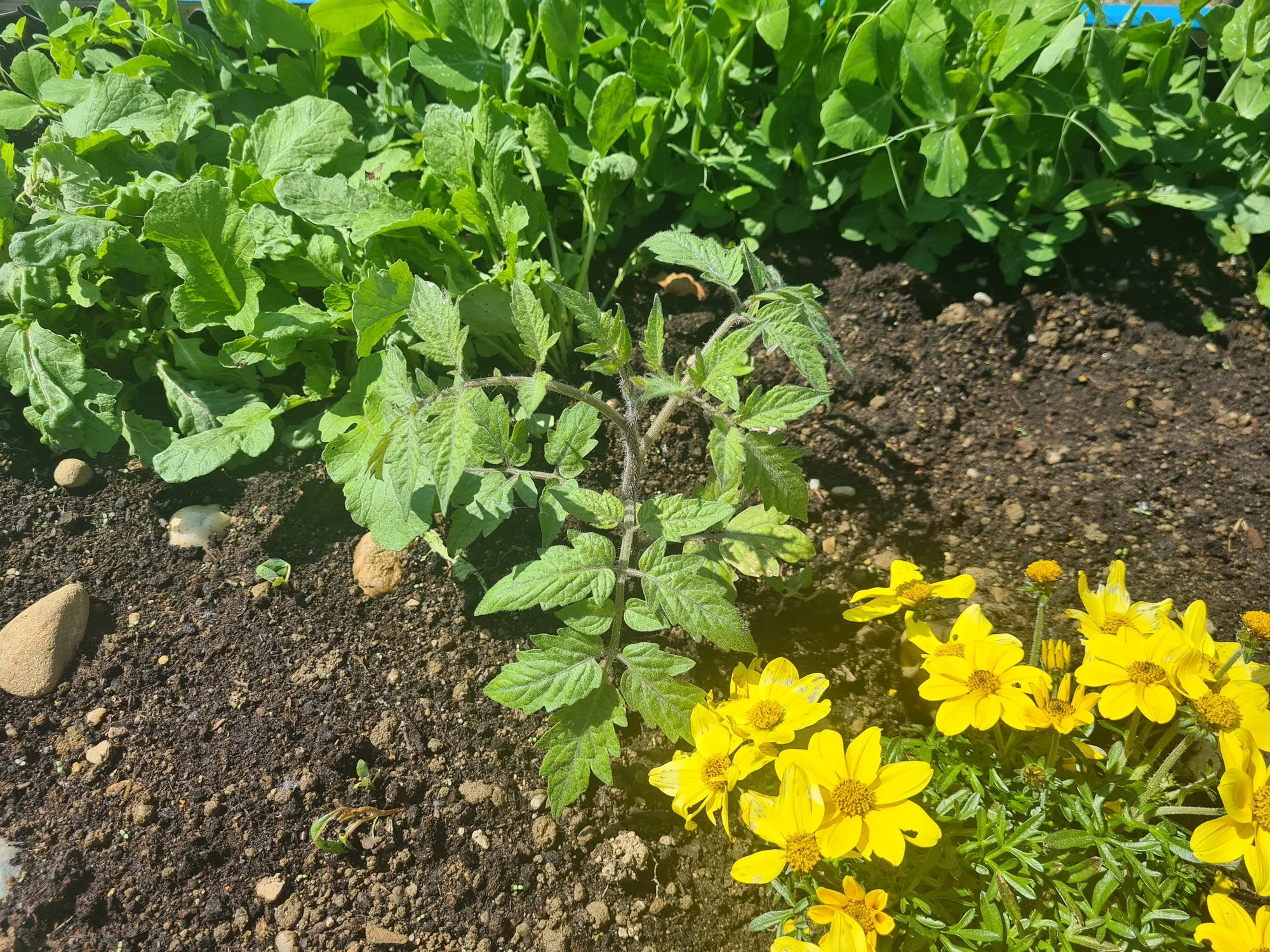 Kohlrabi. Ich bilde mir ein, dass Kohlweißlinge den Tomatengeruch nicht so mögen. Hilft natürlich nicht zu 100% und geht auch nur, weil dort letztes Jahr kein Kohl stand. (und auch keine Tomaten)