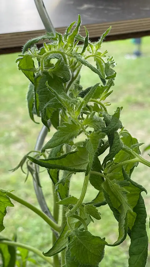 Die oberen Blätter hängen auch, sind aber fest dabei (also nur Wuchs nach unten)