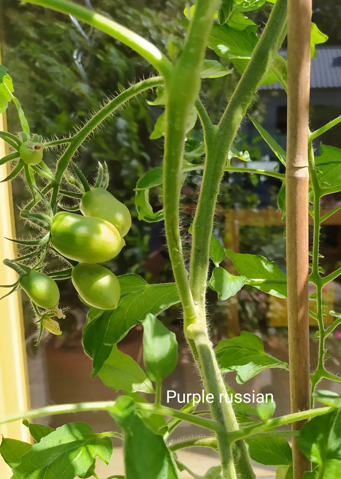 Die Super Marmande wächst sehr gedrungen, dafür aber kräftig und hat auch schon Blüten.
