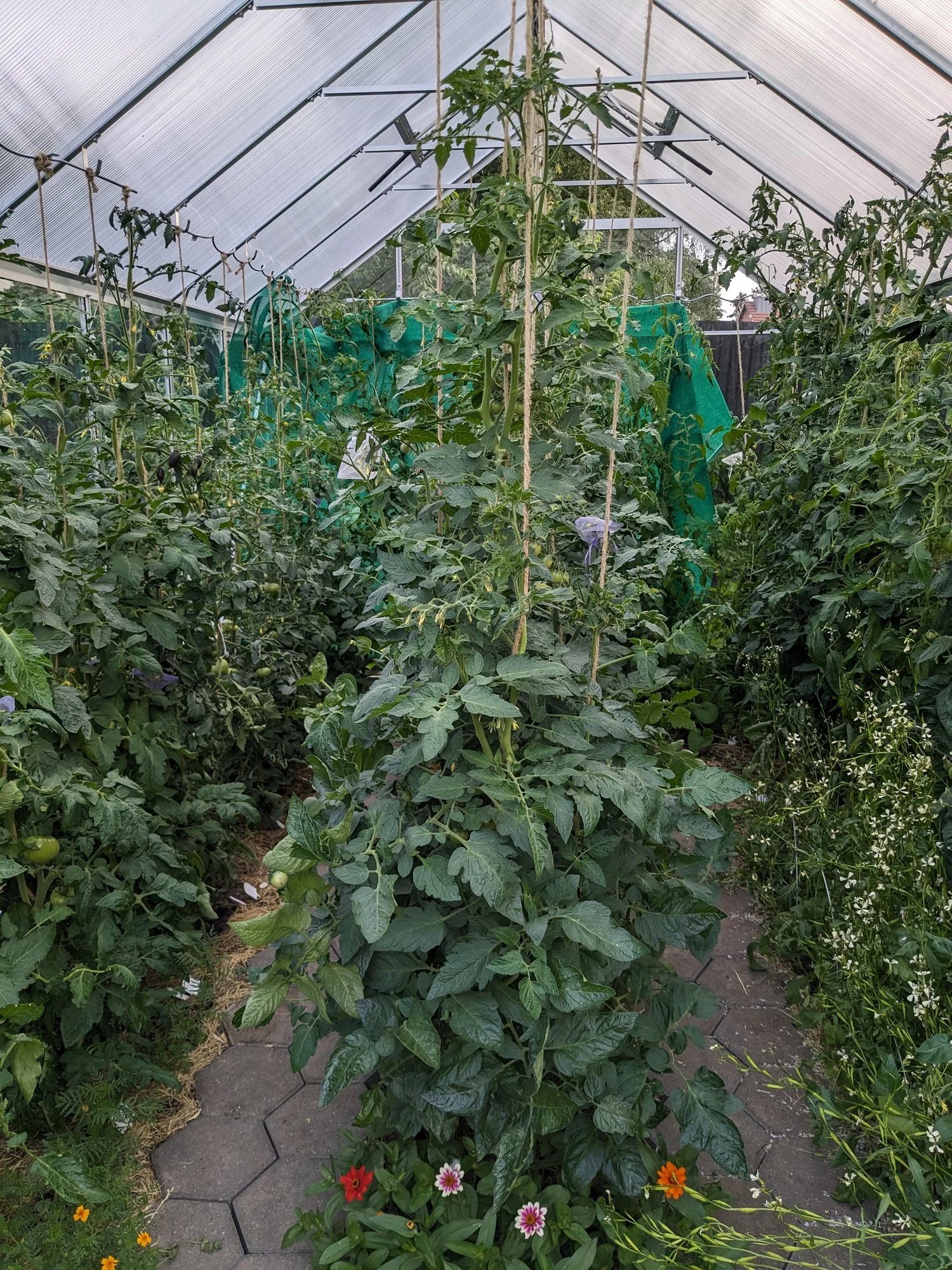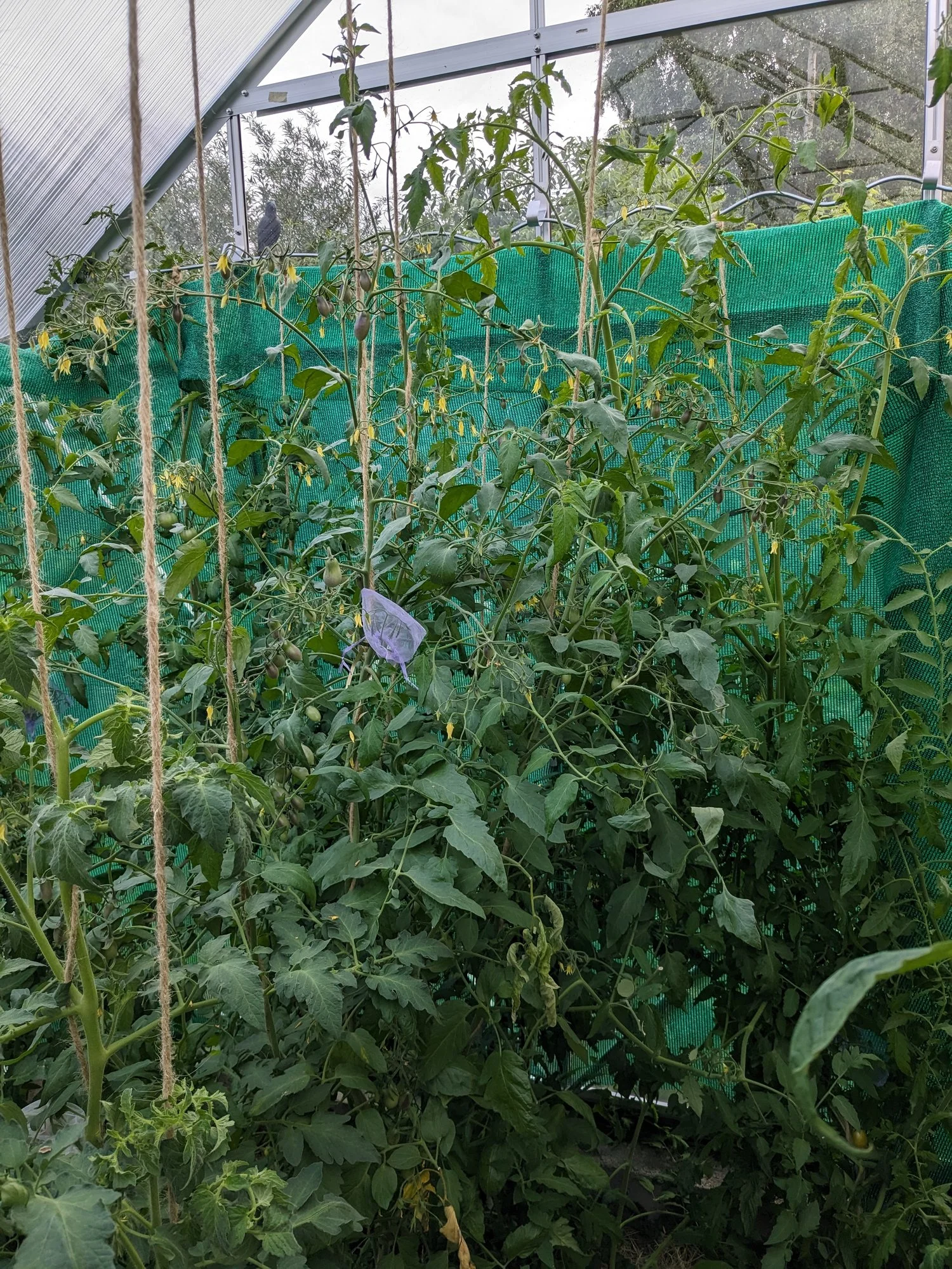 Dem Gewächshaus geht's gut. Nächstes Jahr allerdings entweder mindestens 1 pro Reihe weniger oder nix mit 2triebig. So ist das viel zu sehr Urwald.🤣